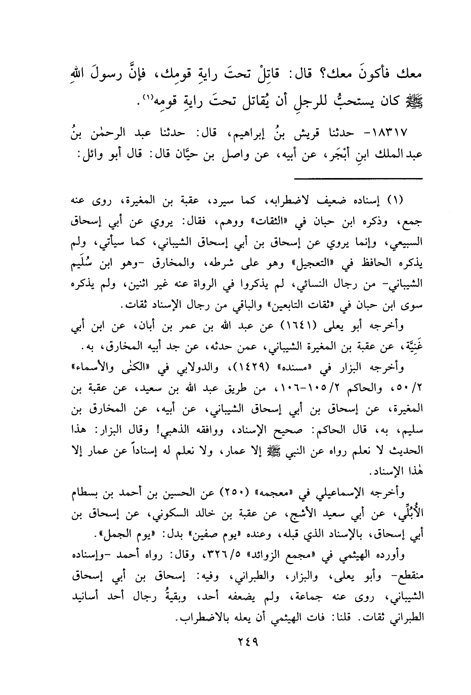١٨٣١٧ - حَدَّثَنَا قُرَيْشُ بْنُ إِبْرَاهِيمَ، قَالَ: حَدَّثَنَا عَبْدُ الرَّحْمَنِ بْنُ عَبْدِ الْمَلِكِ بْنِ أَبْجَرَ، عَنْ أَبِيهِ، عَنْ وَاصِلِ بْنِ حَيَّانَ، قَالَ: قَالَ أَبُو وَائِلٍ: