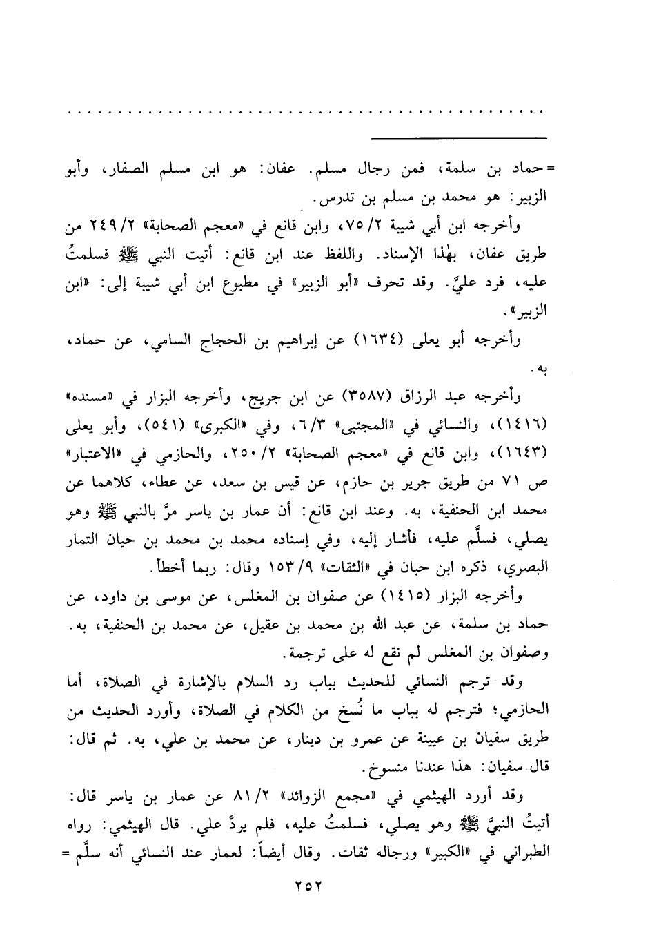 وقد أورد الهيثمي في "مجمع الزوائد" ٢/٨١ عن عمار بن ياسر قال: أتيتُ النبي صَلَّى اللهُ عَلَيْهِ وَسَلَّمَ وهو يصلي، فسلمتُ عليه، فلم يرد علي. قال الهيثمي: رواه الطبراني في "الكبير" ورجاله ثقات. وقال أيضاً: لعمار عند النسائي أنه سلَّم=
