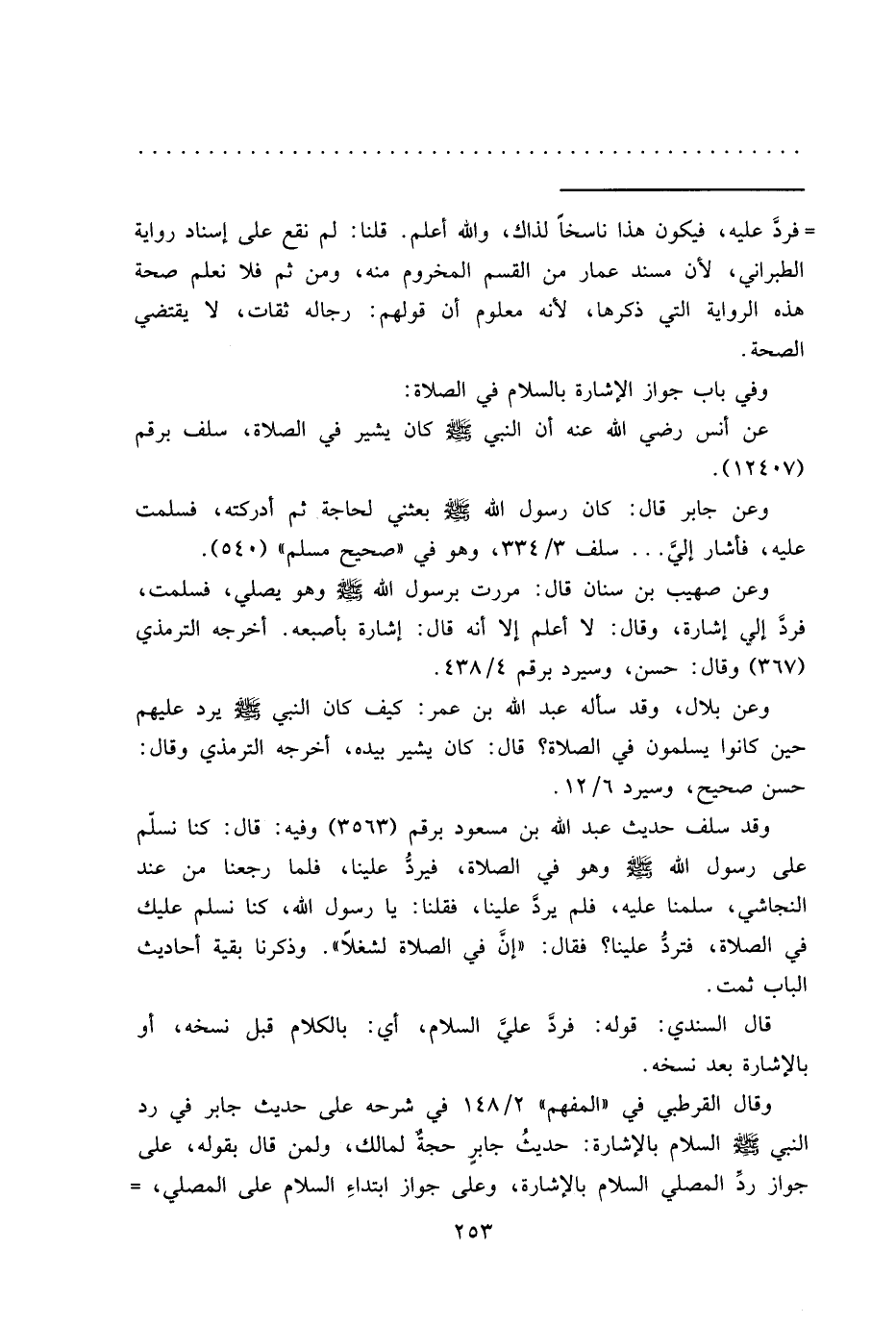 وقال القرطبي في "المفهم" ٢/١٤٨ في شرحه على حديث جابر في رد النبي صَلَّى اللهُ عَلَيْهِ وَسَلَّمَ السلام بالإشارة: حديثُ جابر حجةٌ لمالك، ولمن قال بقوله، على جواز ردِّ المصلي السلام بالإشارة، وعلى جواز ابتداءِ السلام على المصلي،=