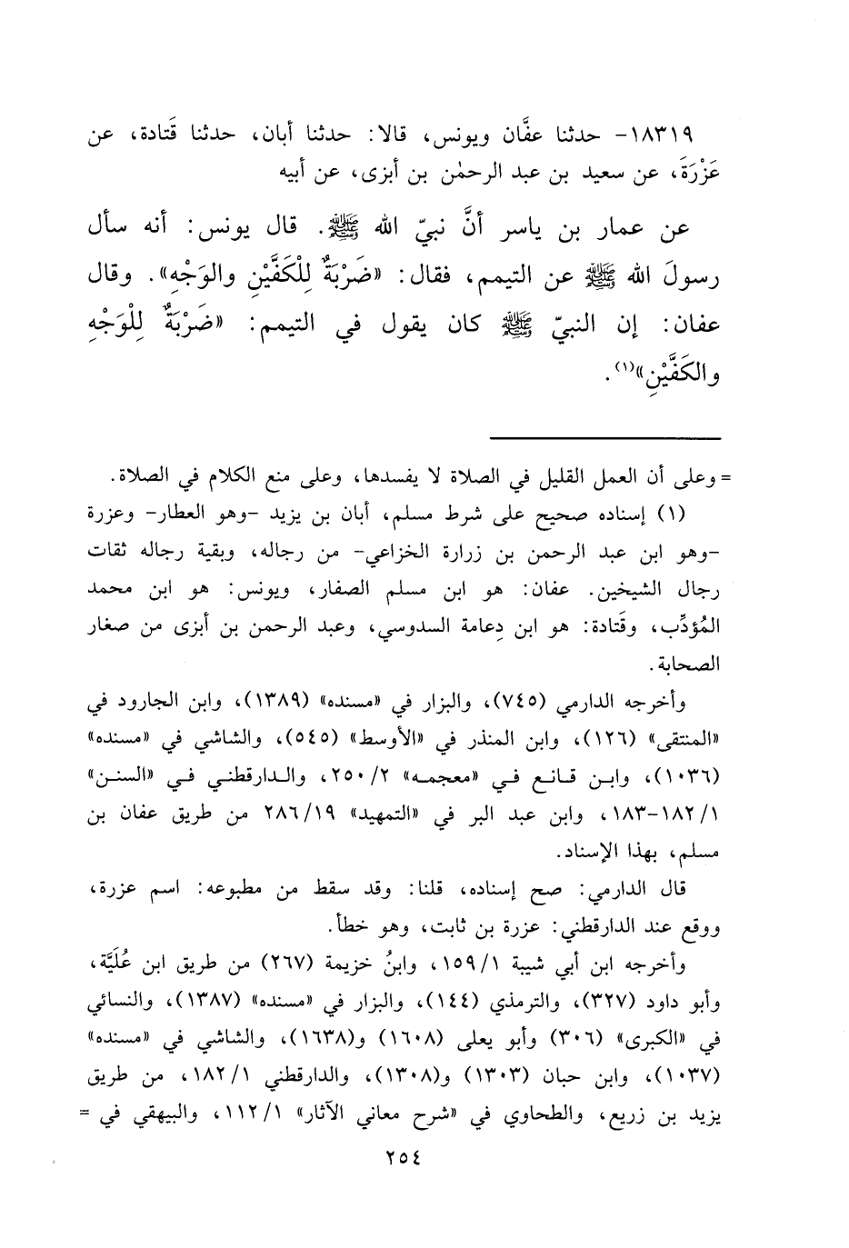 ١٨٣١٩ - حَدَّثَنَا عَفَّانُ، وَيُونُسُ، قَالَا: حَدَّثَنَا أَبَانُ، حَدَّثَنَا قَتَادَةُ، عَنْ عَزْرَةَ، عَنْ سَعِيدِ بْنِ عَبْدِ الرَّحْمَنِ بْنِ أَبْزَى، عَنْ أَبِيهِ، عَنْ عَمَّارِ بْنِ يَاسِرٍ، أَنَّ نَبِيَّ اللهِ صَلَّى اللهُ عَلَيْهِ وَسَلَّمَ، قَالَ يُونُسُ:، إِنَّهُ سَأَلَ رَسُولَ اللهِ صَلَّى اللهُ عَلَيْهِ وَسَلَّمَ عَنِ التَّيَمُّمِ، فَقَالَ: " ضَرْبَةٌ لِلْكَفَّيْنِ وَالْوَجْهِ " وَقَالَ عَفَّانُ: إِنَّ النَّبِيَّ صَلَّى اللهُ عَلَيْهِ وَسَلَّمَ كَانَ يَقُولُ فِي التَّيَمُّمِ: " ضَرْبَةٌ لِلْوَجْهِ وَالْكَفَّيْنِ " (١)