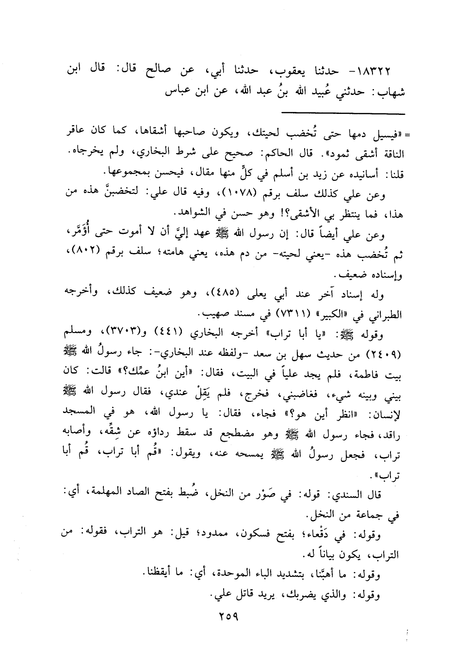 = "فيسيل دمها حتى تُخضب لحيتك، ويكون صاحبها أشقاها، كما كان عاقر الناقة أشقى ثمود". قال الحاكم: صحيح على شرط البخاري، ولم يخرجاه.