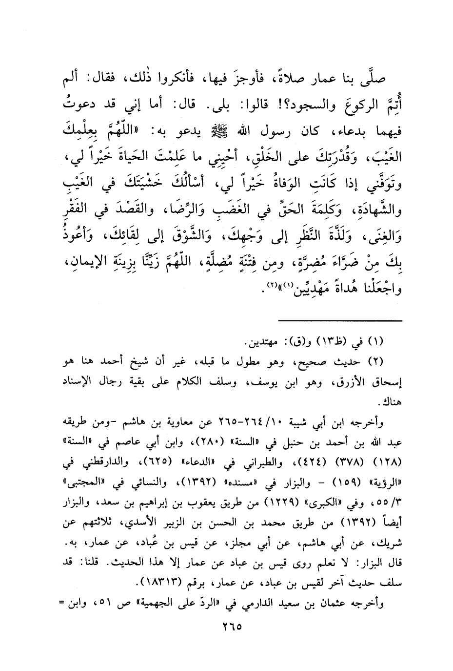صَلَّى بِنَا عَمَّارٌ صَلَاةً، فَأَوْجَزَ فِيهَا، فَأَنْكَرُوا ذَلِكَ، فَقَالَ: أَلَمْ أُتِمَّ الرُّكُوعَ وَالسُّجُودَ؟ قَالُوا: بَلَى، قَالَ: أَمَا إِنِّي قَدْ دَعَوْتُ فِيهِمَا بِدُعَاءٍ، كَانَ رَسُولُ اللهِ صَلَّى اللهُ عَلَيْهِ وَسَلَّمَ يَدْعُو بِهِ: " اللهُمَّ بِعِلْمِكَ الْغَيْبَ، وَقُدْرَتِكَ عَلَى الْخَلْقِ، أَحْيِنِي مَا عَلِمْتَ الْحَيَاةَ خَيْرًا لِي، وَتَوَفَّنِي إِذَا كَانَتِ الْوَفَاةُ خَيْرًا لِي، أَسْأَلُكَ خَشْيَتَكَ فِي الْغَيْبِ وَالشَّهَادَةِ، وَكَلِمَةَ الْحَقِّ فِي الْغَضَبِ وَالرِّضَا، وَالْقَصْدَ فِي الْفَقْرِ وَالْغِنَى، وَلَذَّةَ النَّظَرِ إِلَى وَجْهِكَ، وَالشَّوْقَ إِلَى لِقَائِكَ، وَأَعُوذُ بِكَ مِنْ ضَرَّاءَ مُضِرَّةٍ، وَمِنْ فِتْنَةٍ مُضِلَّةٍ، اللهُمَّ زَيِّنَّا بِزِينَةِ الْإِيمَانِ، وَاجْعَلْنَا هُدَاةً مَهْدِيِّينَ (١) " (٢)