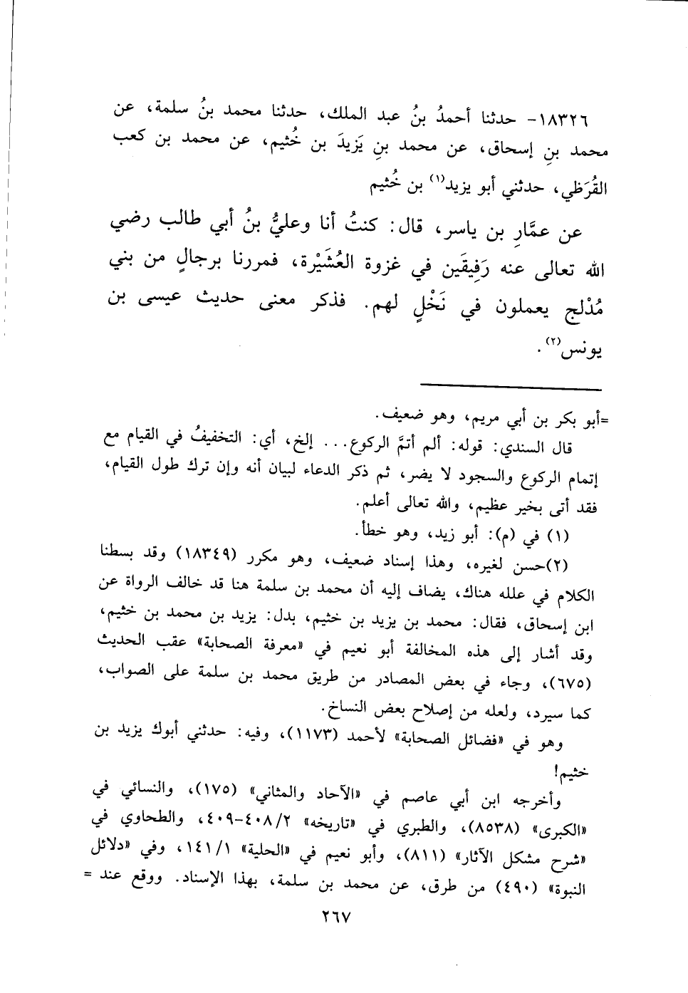 ١٨٣٢٦ - حَدَّثَنَا أَحْمَدُ بْنُ عَبْدِ الْمَلِكِ، حَدَّثَنَا مُحَمَّدُ بْنُ سَلَمَةَ، عَنْ مُحَمَّدِ بْنِ إِسْحَاقَ، عَنْ يَزِيدِ بْنِ مُحَمَّدِ بْنِ خُثَيْمٍ، عَنْ مُحَمَّدِ بْنِ كَعْبٍ الْقُرَظِيِّ، حَدَّثَنِي أَبُو يَزِيدَ (١) بْنُ خُثَيْمٍ، عَنْ عَمَّارِ بْنِ يَاسِرٍ، قَالَ: كُنْتُ أَنَا وَعَلِيُّ بْنُ أَبِي طَالِبٍ رَضِيَ اللهُ تَعَالَى عَنْهُ رَفِيقَيْنِ فِي غَزْوَةِ الْعُشَيْرَةِ، فَمَرَرْنَا بِرِجَالٍ مِنْ بَنِي مُدْلِجٍ يَعْمَلُونَ فِي نَخْلٍ لَهُمْ، فَذَكَرَ مَعْنَى حَدِيثِ عِيسَى بْنِ يُونُسَ (٢)