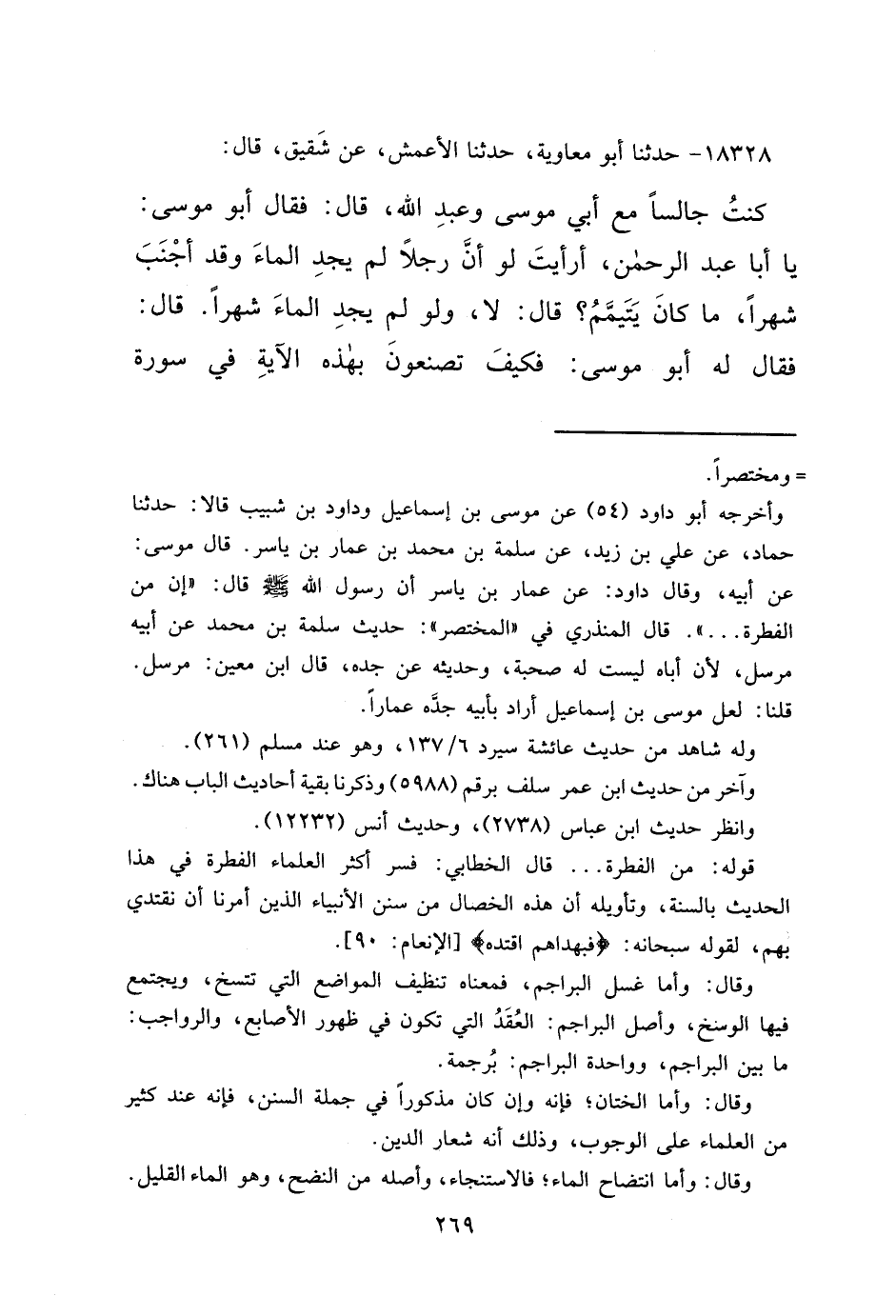 ١٨٣٢٨ - حَدَّثَنَا أَبُو مُعَاوِيَةَ، حَدَّثَنَا الْأَعْمَشُ، عَنْ شَقِيقٍ، قَالَ: كُنْتُ جَالِسًا مَعَ أَبِي مُوسَى، وَعَبْدِ اللهِ، قَالَ: فَقَالَ أَبُو مُوسَى: يَا أَبَا عَبْدِ الرَّحْمَنِ، أَرَأَيْتَ لَوْ أَنَّ رَجُلًا لَمْ يَجِدِ الْمَاءَ، وَقَدْ أَجْنَبَ شَهْرًا مَا كَانَ يَتَيَمَّمُ؟ قَالَ: لَا، وَلَوْ لَمْ يَجِدِ الْمَاءَ شَهْرًا، قَالَ: فَقَالَ لَهُ أَبُو مُوسَى: فَكَيْفَ تَصْنَعُونَ بِهَذِهِ الْآيَةِ فِي سُورَةِ