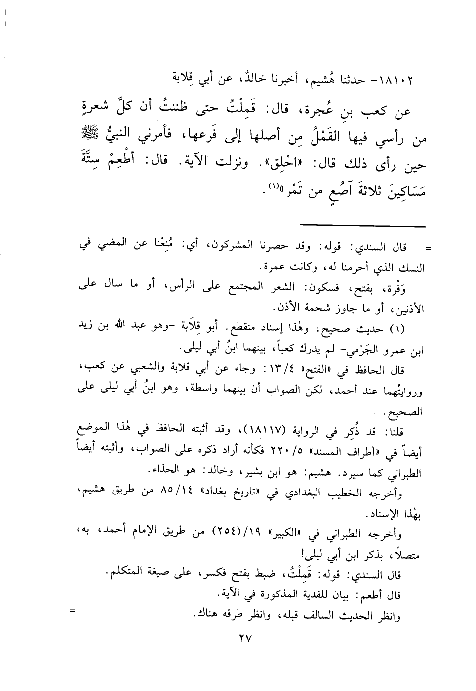 ١٨١٠٢ - حَدَّثَنَا هُشَيْمٌ، أَخْبَرَنَا خَالِدٌ، عَنْ أَبِي قِلَابَةَ، عَنْ كَعْبِ بْنِ عُجْرَةَ، قَالَ: قَمِلْتُ حَتَّى ظَنَنْتُ أَنَّ كُلَّ شَعْرَةٍ مِنْ رَأْسِي فِيهَا الْقَمْلُ مِنْ أَصْلِهَا إِلَى فَرْعِهَا، فَأَمَرَنِي النَّبِيُّ صَلَّى اللهُ عَلَيْهِ وَسَلَّمَ حِينَ رَأَى ذَلِكَ، قَالَ: " احْلِقْ " وَنَزَلَتِ الْآيَةُ، قَالَ: " أَطْعِمْ سِتَّةَ مَسَاكِينَ ثَلَاثَةَ آصُعٍ مِنْ تَمْرٍ " (١)
