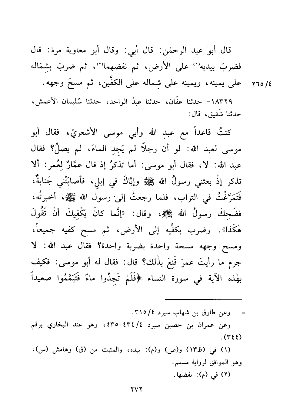 ١٨٣٢٩ - حَدَّثَنَا عَفَّانُ، حَدَّثَنَا عَبْدُ الْوَاحِدِ، حَدَّثَنَا سُلَيْمَانُ الْأَعْمَشُ، حَدَّثَنَا شَقِيقٌ، قَالَ: كُنْتُ قَاعِدًا مَعَ عَبْدِ اللهِ، وَأَبِي مُوسَى الْأَشْعَرِيِّ، فَقَالَ: أَبُو مُوسَى لِعَبْدِ اللهِ: لَوْ أَنَّ رَجُلًا لَمْ يَجِدِ الْمَاءَ، لَمْ يُصَلِّ؟ فَقَالَ عَبْدُ اللهِ: لَا، فَقَالَ أَبُو مُوسَى: أَمَا تَذْكُرُ إِذْ قَالَ عَمَّارٌ لِعُمَرَ: أَلَا تَذْكُرُ إِذْ بَعَثَنِي رَسُولُ اللهِ صَلَّى اللهُ عَلَيْهِ وَسَلَّمَ، وَإِيَّاكَ فِي إِبِلٍ، فَأَصَابَتْنِي جَنَابَةٌ، فَتَمَرَّغْتُ فِي التُّرَابِ، فَلَمَّا رَجَعْتُ إِلَى رَسُولِ اللهِ صَلَّى اللهُ عَلَيْهِ وَسَلَّمَ، أَخْبَرْتُهُ، فَضَحِكَ رَسُولُ اللهِ صَلَّى اللهُ عَلَيْهِ وَسَلَّمَ، وَقَالَ: " إِنَّمَا كَانَ يَكْفِيكَ أَنْ تَقُولَ هَكَذَا " وَضَرَبَ بِكَفَّيْهِ إِلَى الْأَرْضِ، ثُمَّ مَسَحَ كَفَّيْهِ جَمِيعًا، وَمَسَحَ وَجْهَهُ مَسْحَةً وَاحِدَةً بِضَرْبَةٍ وَاحِدَةٍ؟ فَقَالَ عَبْدُ اللهِ: لَا جَرَمَ مَا رَأَيْتُ عُمَرَ قَنَعَ بِذَلِكَ؟ قَالَ: فَقَالَ لَهُ أَبُو مُوسَى: فَكَيْفَ بِهَذِهِ الْآيَةِ فِي سُورَةِ النِّسَاءِ {فَلَمْ تَجِدُوا مَاءً فَتَيَمَّمُوا صَعِيدًا