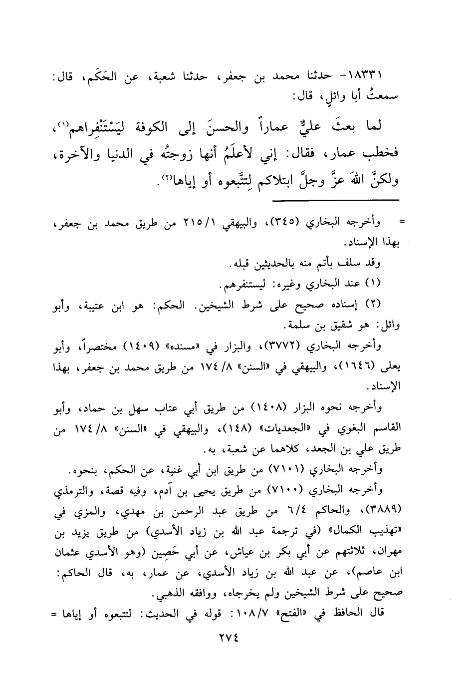 ١٨٣٣١ - حَدَّثَنَا مُحَمَّدُ بْنُ جَعْفَرٍ، حَدَّثَنَا شُعْبَةُ، عَنِ الْحَكَمِ، قَالَ: سَمِعْتُ أَبَا وَائِلٍ، قَالَ: لَمَّا بَعَثَ عَلِيٌّ عَمَّارًا، وَالْحَسَنَ إِلَى الْكُوفَةِ لِيَسْتَنْفِرَاهُمْ، (١) فَخَطَبَ عَمَّارٌ، فَقَالَ: " إِنِّي لَأَعْلَمُ أَنَّهَا زَوْجَتُهُ فِي الدُّنْيَا وَالْآخِرَةِ، وَلَكِنَّ اللهَ عَزَّ وَجَلَّ ابْتَلَاكُمْ لِتَتَّبِعُوهُ أَوْ إِيَّاهَا " (٢)