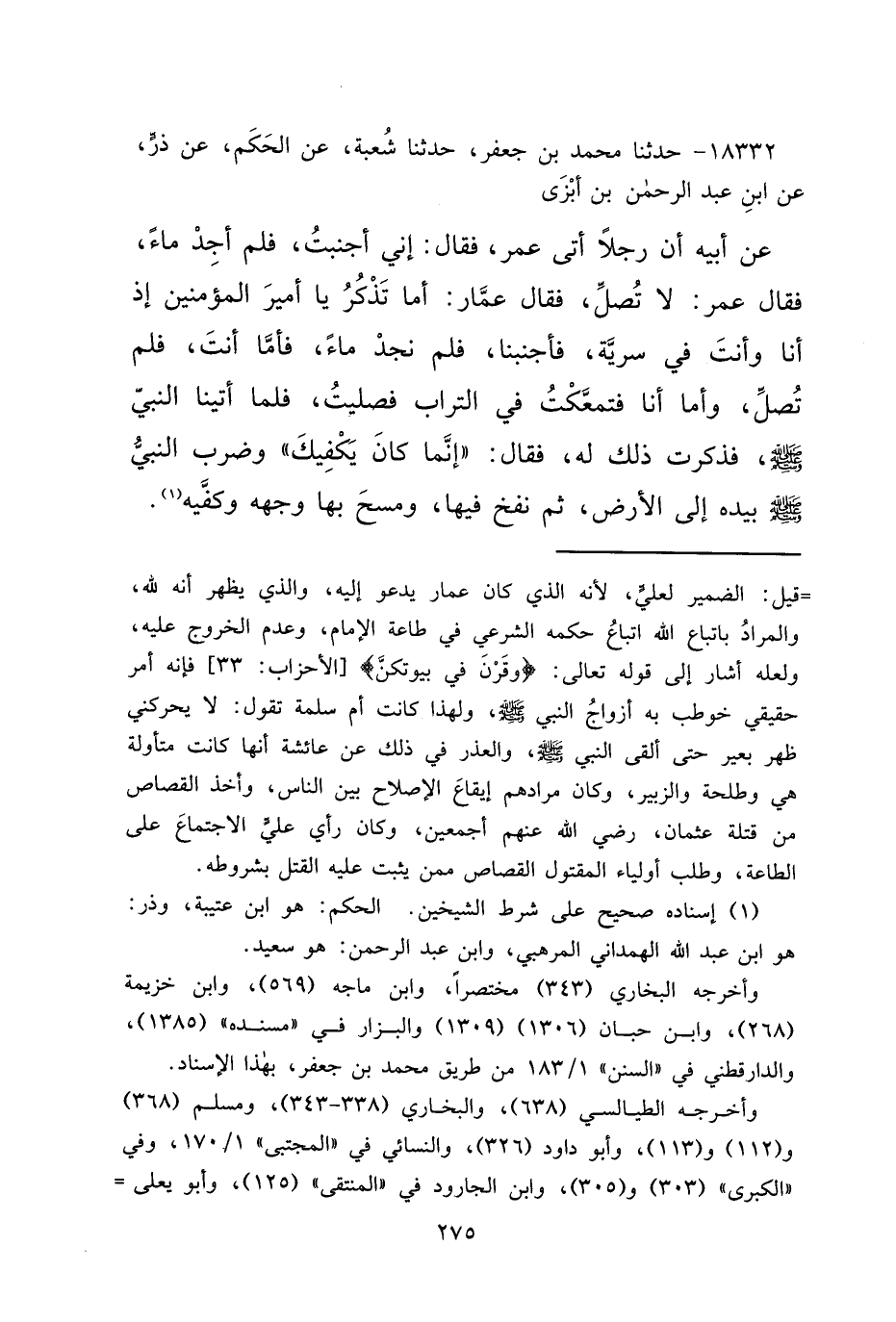 ١٨٣٣٢ - حَدَّثَنَا مُحَمَّدُ بْنُ جَعْفَرٍ، حَدَّثَنَا شُعْبَةُ، عَنِ الْحَكَمِ، عَنْ ذَرٍّ، عَنِ ابْنِ عَبْدِ الرَّحْمَنِ بْنِ أَبْزَى، عَنْ أَبِيهِ أَنَّ رَجُلًا أَتَى عُمَرَ، فَقَالَ: إِنِّي أَجْنَبْتُ، فَلَمْ أَجِدْ مَاءً، فَقَالَ عُمَرُ: لَا تُصَلِّ، فَقَالَ عَمَّارٌ: أَمَا تَذْكُرُ يَا أَمِيرَ الْمُؤْمِنِينَ إِذْ أَنَا وَأَنْتَ فِي سَرِيَّةٍ، فَأَجْنَبْنَا، فَلَمْ نَجِدْ مَاءً، فَأَمَّا أَنْتَ، فَلَمْ تُصَلِّ، وَأَمَّا أَنَا فَتَمَعَّكْتُ فِي التُّرَابِ فَصَلَّيْتُ، فَلَمَّا أَتَيْنَا النَّبِيَّ صَلَّى اللهُ عَلَيْهِ وَسَلَّمَ، فَذَكَرْتُ ذَلِكَ لَهُ، فَقَالَ: " إِنَّمَا كَانَ يَكْفِيكَ " وَضَرَبَ النَّبِيُّ صَلَّى اللهُ عَلَيْهِ وَسَلَّمَ، بِيَدِهِ إِلَى الْأَرْضِ، ثُمَّ نَفَخَ فِيهَا، وَمَسَحَ بِهَا وَجْهَهُ، وَكَفَّيْهِ (١)