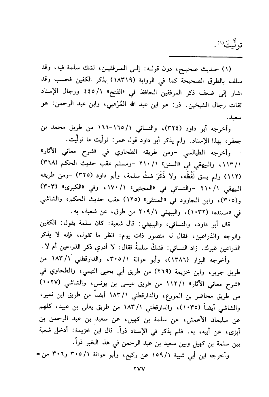 قال أبو داود، والنسائي، والبيهقي: قال شعبة: كان سلمة يقول: الكفين والوجه والذراعين، فقال له منصور ذات يوم: انظر ما تقول، فإنه لا يذكر الذراعين غيرك. زاد النسائي: فشك سلمةُ فقال: لا أدري ذكر الذراعين أم لا.