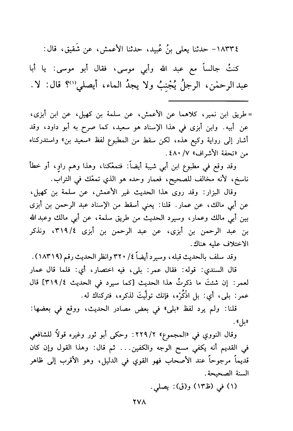 ١٨٣٣٤ - حَدَّثَنَا يَعْلَى بْنُ عُبَيْدٍ، حَدَّثَنَا الْأَعْمَشُ، عَنْ شَقِيقٍ، قَالَ: كُنْتُ جَالِسًا مَعَ عَبْدِ اللهِ وَأَبِي مُوسَى، فَقَالَ أَبُو مُوسَى: يَا أَبَا عَبْدِ الرَّحْمَنِ، الرَّجُلُ يُجْنِبُ وَلَا يَجِدُ الْمَاءَ، أَيُصَلِّي (١) ؟ قَالَ: لَا،