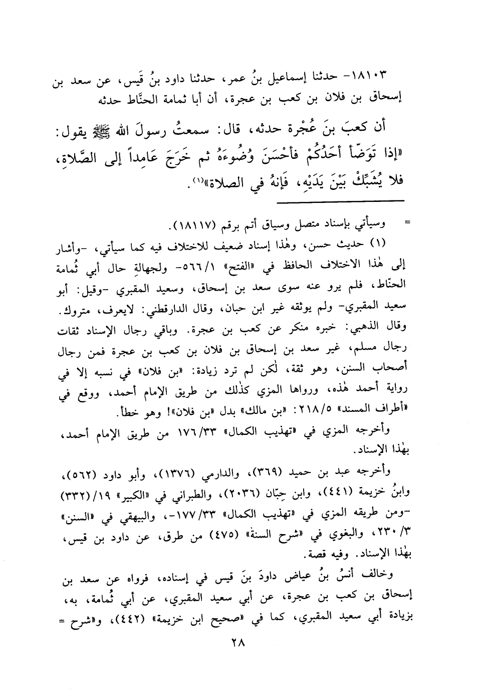 ١٨١٠٣ - حَدَّثَنَا إِسْمَاعِيلُ بْنُ عُمَرَ، حَدَّثَنَا دَاوُدُ بْنُ قَيْسٍ، عَنْ سَعْدِ بْنِ إِسْحَاقَ بْنِ فُلَانِ بْنِ كَعْبِ بْنِ عُجْرَةَ، أَنَّ أَبَا ثُمَامَةَ الْحَنَّاطَ، حَدَّثَهُ أَنَّ كَعْبَ بْنَ عُجْرَةَ حَدَّثَهُ قَالَ: سَمِعْتُ رَسُولَ اللهِ صَلَّى اللهُ عَلَيْهِ وَسَلَّمَ، يَقُولُ: " إِذَا تَوَضَّأَ أَحَدُكُمْ، فَأَحْسَنَ وُضُوءَهُ، ثُمَّ خَرَجَ عَامِدًا إِلَى الصَّلَاةِ، فَلَا يُشَبِّكْ بَيْنَ يَدَيْهِ، فَإِنَّهُ فِي الصَّلَاةِ " (١)