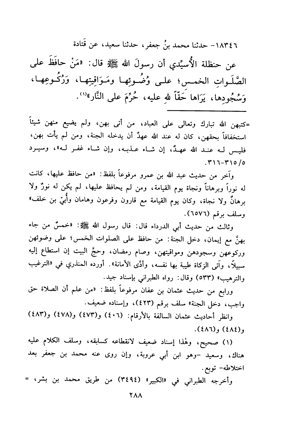 ١٨٣٤٦ - حَدَّثَنَا مُحَمَّدُ بْنُ جَعْفَرٍ، حَدَّثَنَا سَعِيدٌ، عَنْ قَتَادَةَ، عَنْ حَنْظَلَةَ الْأُسَيْدِيِّ، أَنَّ رَسُولَ اللهِ صَلَّى اللهُ عَلَيْهِ وَسَلَّمَ، قَالَ: " مَنْ حَافَظَ عَلَى الصَّلَوَاتِ الْخَمْسِ، عَلَى وُضُوئِهَا، وَمَوَاقِيتِهَا، وَرُكُوعِهَا، وَسُجُودِهَا، يَرَاهَا حَقًّا لِلَّهِ عَلَيْهِ، حُرِّمَ عَلَى النَّارِ " (١)