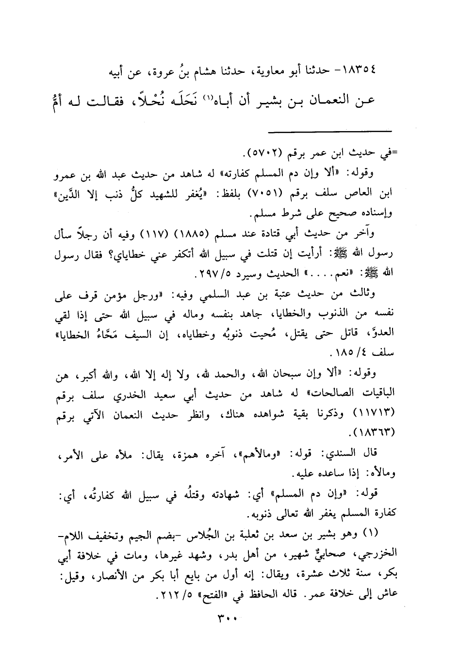 ١٨٣٥٤ - حَدَّثَنَا أَبُو مُعَاوِيَةَ، حَدَّثَنَا هِشَامُ بْنُ عُرْوَةَ، عَنْ أَبِيهِ، عَنِ النُّعْمَانِ بْنِ بَشِيرٍ، أَنَّ أَبَاهُ (١) نَحَلَهُ نُحْلًا، فَقَالَتْ لَهُ أُمُّ