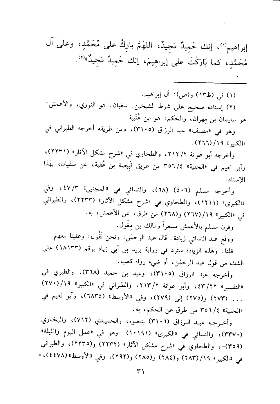 إِبْرَاهِيمَ، (١) إِنَّكَ حَمِيدٌ مَجِيدٌ، اللهُمَّ بَارِكْ عَلَى مُحَمَّدٍ، وَعَلَى آلِ مُحَمَّدٍ، كَمَا بَارَكْتَ عَلَى إِبْرَاهِيمَ، إِنَّكَ حَمِيدٌ مَجِيدٌ " (٢)