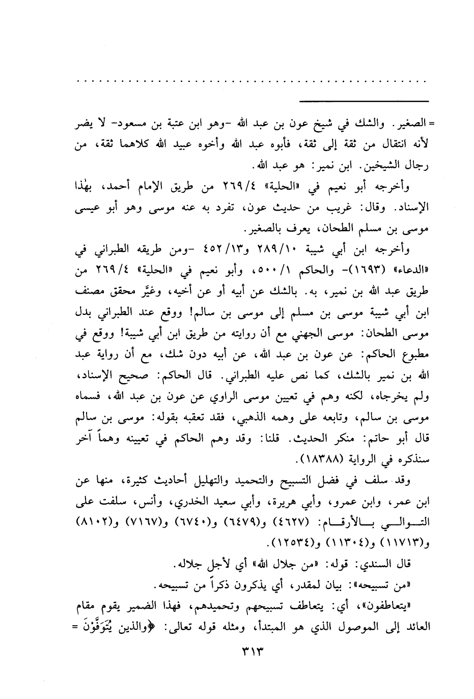 مطبوع الحاكم: عن عون بن عبد الله، عن أبيه دون شك، مع أن رواية عبد الله بن نمير بالشك، كما نص عليه الطبراني. قال الحاكم: صحيح الإسناد، ولم يخرجاه، لكنه وهم في تعيين موسى الراوي عن عون بن عبد الله، فسماه موسى بن سالم، وتابعه على وهمه الذهبي، فقد تعقبه بقوله: موسى بن سالم قال أبو حاتم: منكر الحديث. قلنا: وقد وهم الحاكم في تعيينه وهماً آخر سنذكره في الرواية (١٨٣٨٨) .