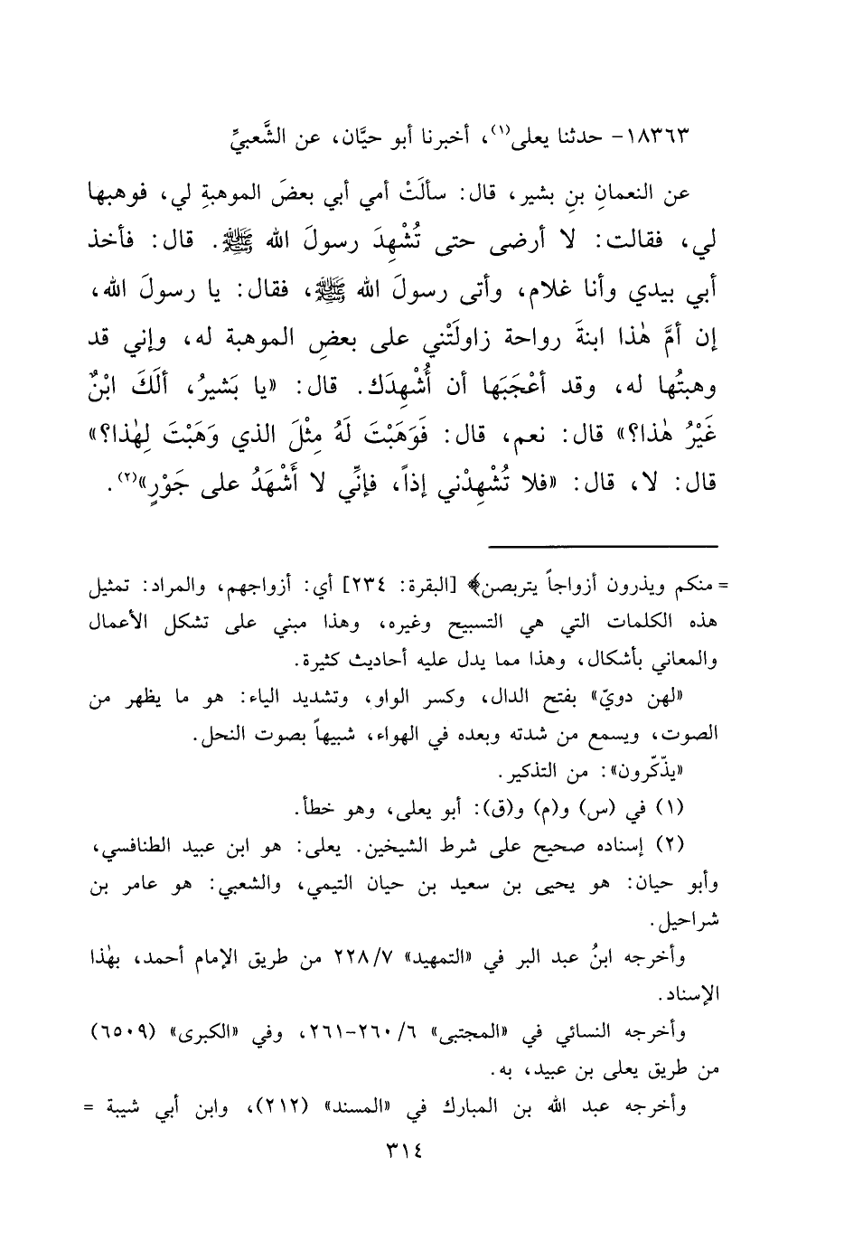 ١٨٣٦٣ - حَدَّثَنَا يَعْلَى، (١) أَخْبَرَنَا أَبُو حَيَّانَ، عَنِ الشَّعْبِيِّ، عَنِ النُّعْمَانِ بْنِ بَشِيرٍ، قَالَ: سَأَلَتْ أُمِّي أَبِي بَعْضَ الْمَوْهِبَةِ لِي، فَوَهَبَهَا لِي. فَقَالَتْ: لَا أَرْضَى حَتَّى تُشْهِدَ رَسُولَ اللهِ صَلَّى اللهُ عَلَيْهِ وَسَلَّمَ، قَالَ: فَأَخَذَ أَبِي بِيَدِي وَأَنَا غُلَامٌ، وَأَتَى رَسُولَ اللهِ صَلَّى اللهُ عَلَيْهِ وَسَلَّمَ، فَقَالَ: يَا رَسُولَ اللهِ، إِنَّ أُمَّ هَذَا ابْنَةَ رَوَاحَةَ زَاوَلَتْنِي عَلَى بَعْضِ الْمَوْهِبَةِ لَهُ، وَإِنِّي قَدْ وَهَبْتُهَا لَهُ، وَقَدْ أَعْجَبَهَا أَنْ أُشْهِدَكَ. قَالَ: " يَا بَشِيرُ، أَلَكَ ابْنٌ غَيْرُ هَذَا؟ " قَالَ: نَعَمْ، قَالَ: " فَوَهَبْتَ لَهُ مِثْلَ الَّذِي وَهَبْتَ لِهَذَا؟ " قَالَ: لَا، قَالَ: " فَلَا تُشْهِدْنِي إِذًا، فَإِنِّي لَا أَشْهَدُ عَلَى جَوْرٍ " (٢)