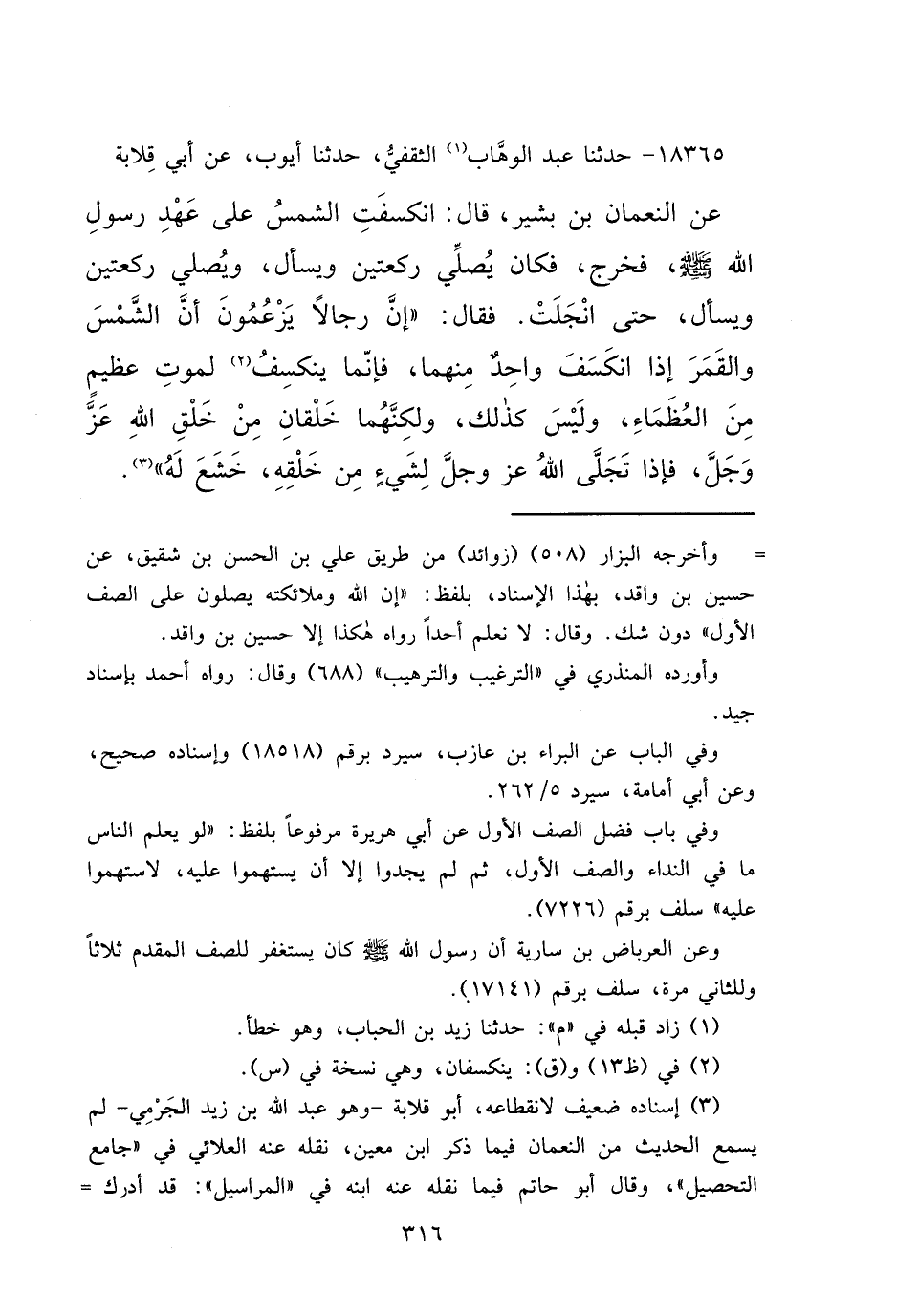 ١٨٣٦٥ - حَدَّثَنَا عَبْدُ الْوَهَّابِ (١) الثَّقَفِيُّ، حَدَّثَنَا أَيُّوبُ، عَنْ أَبِي قِلَابَةَ، عَنِ النُّعْمَانِ بْنِ بَشِيرٍ، قَالَ: انْكَسَفَتِ الشَّمْسُ عَلَى عَهْدِ رَسُولِ اللهِ صَلَّى اللهُ عَلَيْهِ وَسَلَّمَ، فَخَرَجَ فَكَانَ يُصَلِّي رَكْعَتَيْنِ وَيَسْأَلُ، وَيُصَلِّي رَكْعَتَيْنِ وَيَسْأَلُ، حَتَّى انْجَلَتْ، فَقَالَ: " إِنَّ رِجَالًا يَزْعُمُونَ أَنَّ الشَّمْسَ وَالْقَمَرَ إِذَا انْكَسَفَ وَاحِدٌ مِنْهُمَا، فَإِنَّمَا يَنْكَسِفُ (٢) لِمَوْتِ عَظِيمٍ مِنَ الْعُظَمَاءِ، وَلَيْسَ كَذَلِكَ، وَلَكِنَّهُمَا خَلْقَانِ مِنْ خَلْقِ اللهِ عَزَّ وَجَلَّ، فَإِذَا تَجَلَّى الله عَزَّ وَجَلَّ لِشَيْءٍ مِنْ خَلْقِهِ خَشَعَ لَهُ " (٣)