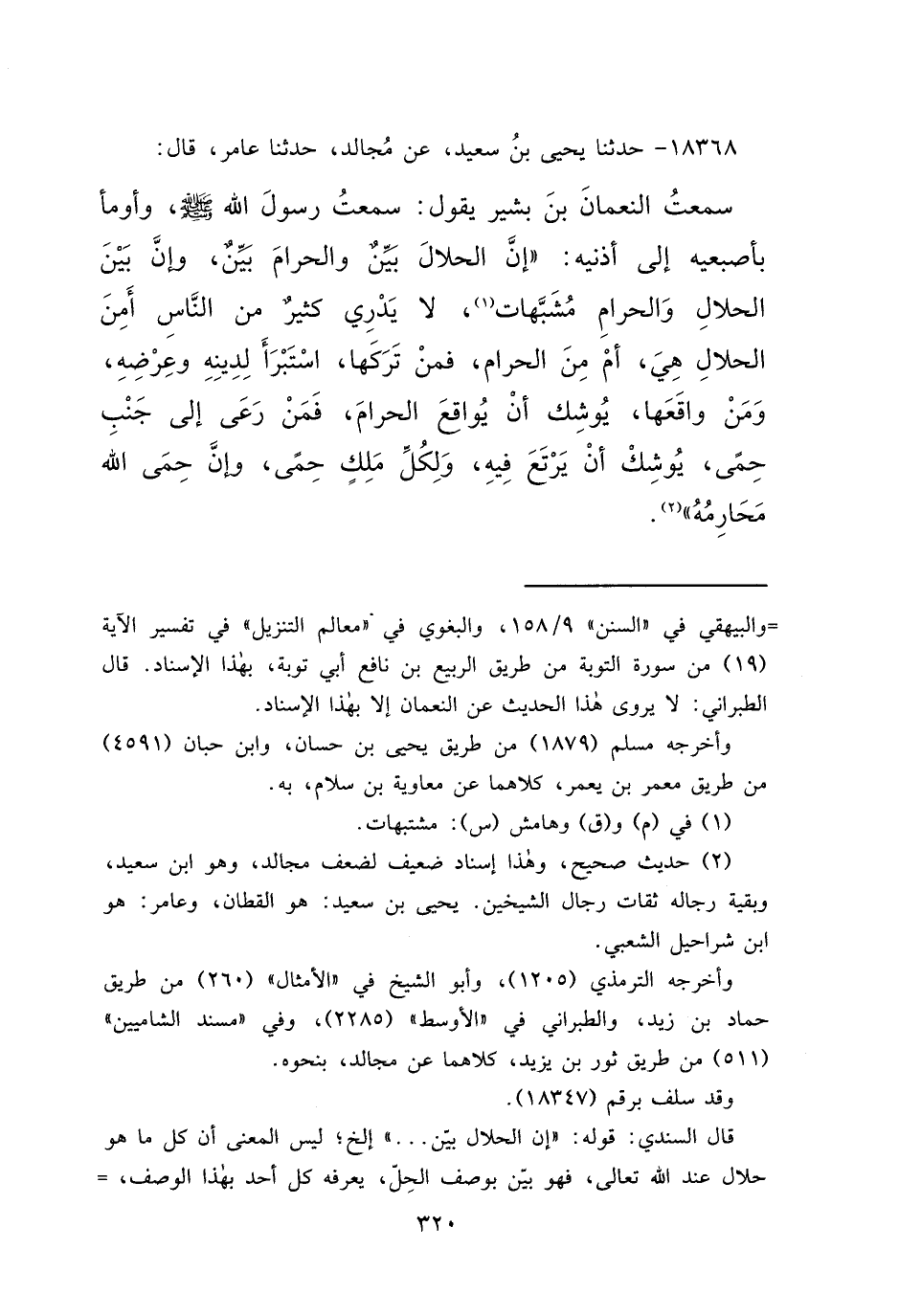 ١٨٣٦٨ - حَدَّثَنَا يَحْيَى بْنُ سَعِيدٍ، عَنْ مُجَالِدٍ، حَدَّثَنَا عَامِرٌ، قَالَ: سَمِعْتُ النُّعْمَانَ بْنَ بَشِيرٍ يَقُولُ: سَمِعْتُ رَسُولَ اللهِ صَلَّى اللهُ عَلَيْهِ وَسَلَّمَ، وَأَوْمَأَ بِإِصْبَعَيْهِ إِلَى أُذُنَيْهِ، " إِنَّ الْحَلَالَ بَيِّنٌ، وَالْحَرَامَ بَيِّنٌ، وَإِنَّ بَيْنَ الْحَلَالِ وَالْحَرَامِ مُشَبَّهَاتٍ، (١) لَا يَدْرِي كَثِيرٌ مِنَ النَّاسِ أَمِنَ الْحَلَالِ هِيَ، أَمْ مِنَ الْحَرَامِ، فَمَنْ تَرَكَهَا، اسْتَبْرَأَ لِدِينِهِ وَعِرْضِهِ، وَمَنْ وَاقَعَهَا، يُوشِكُ أَنْ يُوَاقِعَ الْحَرَامَ، فَمَنْ رَعَى إِلَى جَنْبِ حِمًى، يُوشِكُ أَنْ يَرْتَعَ فِيهِ، وَلِكُلِّ مَلِكٍ حِمًى، وَإِنَّ حِمَى اللهِ مَحَارِمُهُ " (٢)