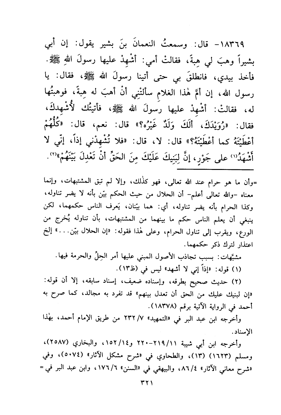 ١٨٣٦٩ - قَالَ: وَسَمِعْتُ النُّعْمَانَ بْنَ بَشِيرٍ، يَقُولُ: إِنَّ أَبِي بَشِيرًا وَهَبَ لِي هِبَةً، فَقَالَتْ أُمِّي: أَشْهِدْ عَلَيْهَا رَسُولَ اللهِ صَلَّى اللهُ عَلَيْهِ وَسَلَّمَ، فَأَخَذَ بِيَدِي، فَانْطَلَقَ بِي حَتَّى أَتَيْنَا رَسُولَ اللهِ صَلَّى اللهُ عَلَيْهِ وَسَلَّمَ، فَقَالَ: يَا رَسُولَ اللهِ، إِنَّ أُمَّ هَذَا الْغُلَامِ سَأَلَتْنِي أَنْ أَهَبَ لَهُ هِبَةً، فَوَهَبْتُهَا لَهُ، فَقَالَتْ: أَشْهِدْ عَلَيْهَا رَسُولَ اللهِ صَلَّى اللهُ عَلَيْهِ وَسَلَّمَ، فَأَتَيْتُكَ لِأُشْهِدَكَ، فَقَالَ: " رُوَيْدَكَ، أَلَكَ وَلَدٌ غَيْرُهُ؟ " قَالَ: نَعَمْ، قَالَ: " كُلُّهُمْ أَعْطَيْتَهُ كَمَا أَعْطَيْتَهُ؟ " قَالَ: لَا قَالَ: " فَلَا تُشْهِدْنِي إِذًا، إِنِّي لَا أَشْهَدُ (١) عَلَى جَوْرٍ، إِنَّ لِبَنِيكَ عَلَيْكَ مِنَ الْحَقِّ أَنْ تَعْدِلَ بَيْنَهُمْ " (٢)