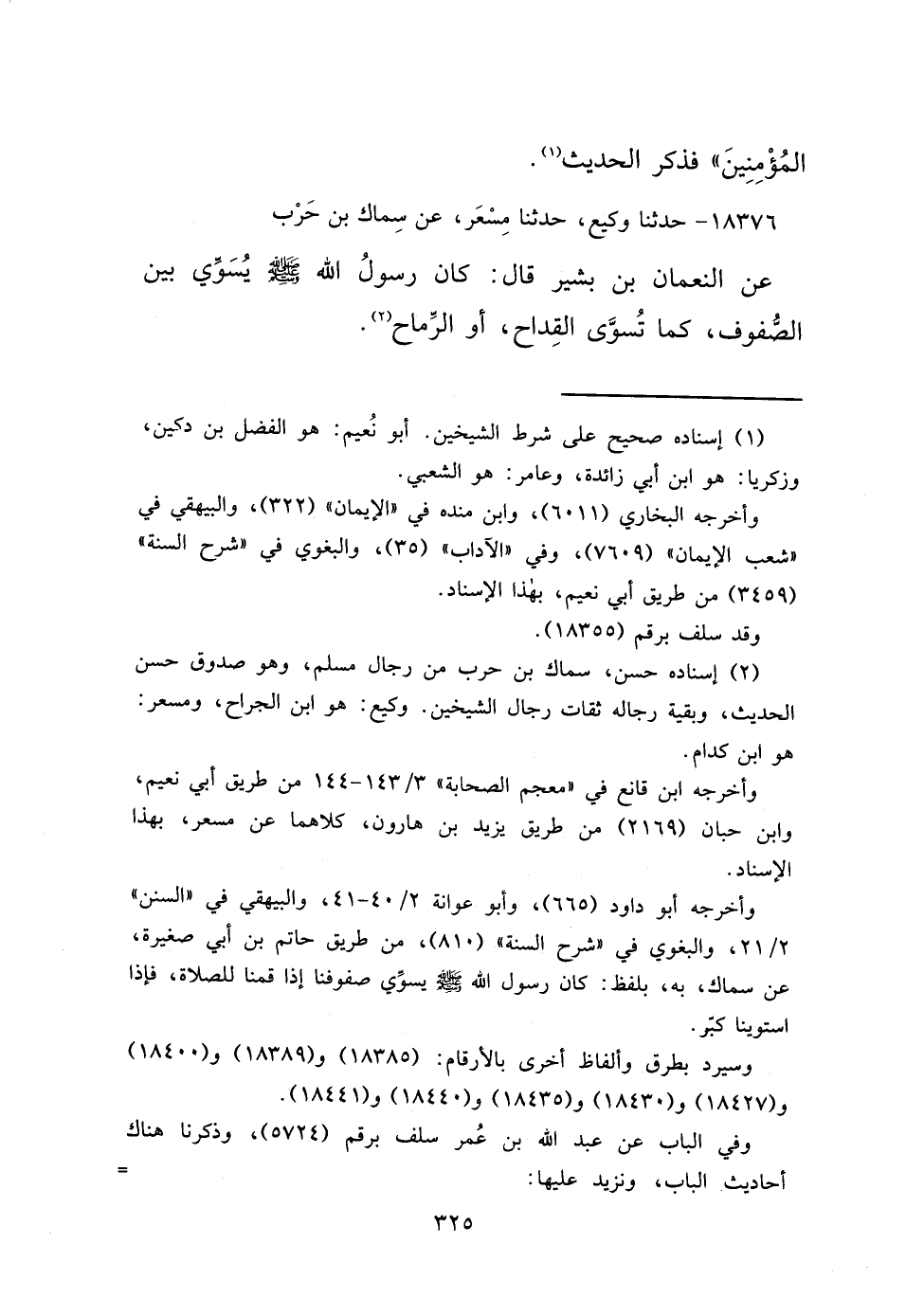 ١٨٣٧٦ - حَدَّثَنَا وَكِيعٌ، حَدَّثَنَا مِسْعَرٌ، عَنْ سِمَاكِ بْنِ حَرْبٍ، عَنِ النُّعْمَانِ بْنِ بَشِيرٍ، قَالَ: " كَانَ رَسُولُ اللهِ صَلَّى اللهُ عَلَيْهِ وَسَلَّمَ، يُسَوِّي بَيْنَ الصُّفُوفِ كَمَا تُسَوَّى الْقِدَاحُ، أَوِ الرِّمَاحُ، " (٢)