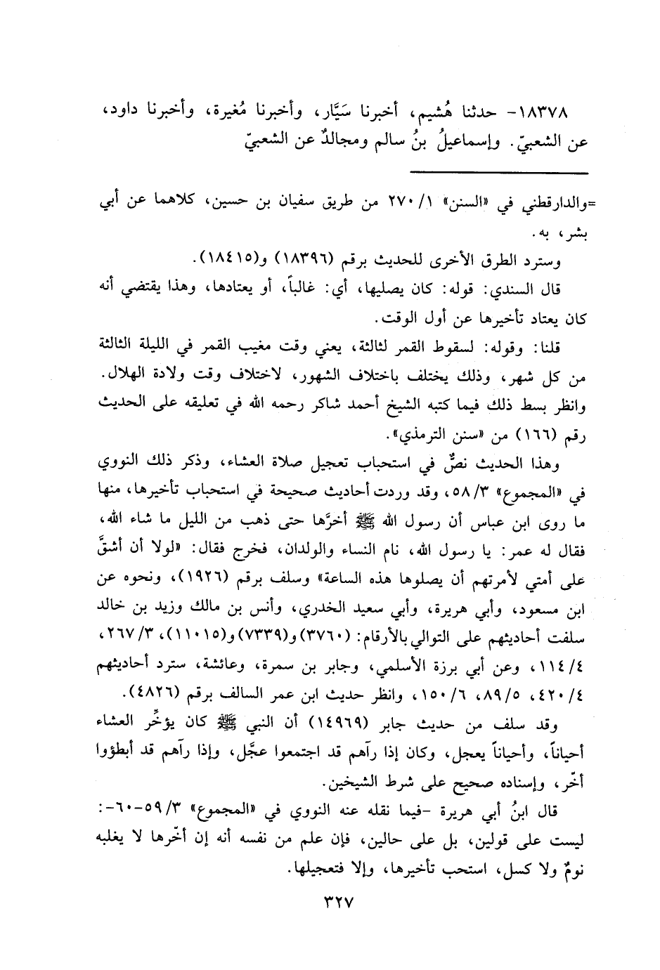 وهذا الحديث نص في استحباب تعجيل صلاة العشاء، وذكر ذلك النووي في "المجموع" ٣/٥٨، وقد وردت أحاديث صحيحة في استحباب تأخيرها، منها ما روى ابن عباس أن رسول الله صَلَّى اللهُ عَلَيْهِ وَسَلَّمَ أخرَّها حتى ذهب من الليل ما شاء الله، فقال له عمر: يا رسول الله، نام النساء والولدان، فخرج فقال: "لولا أن أشقّ على أمتي لأمرتهم أن يصلوها هذه الساعة" وسلف برقم (١٩٢٦) ، ونحوه عن ابن مسعود، وأبي هريرة، وأبي سعيد الخدري، وأنس بن مالك وزيد بن خالد سلفت أحاديثهم على التوالي بالأرقام: (٣٧٦٠) و (٧٣٣٩) و (١١٠١٥) ، ٣/٢٦٧، ٤/١١٤، وعن أبي برزة الأسلمي، وجابر بن سمرة، وعائشة، سترد أحاديثهم ٤/٤٢٠، ٥/٨٩، ٦/١٥٠، وانظر حديث ابن عمر السالف برقم (٤٨٢٦) .