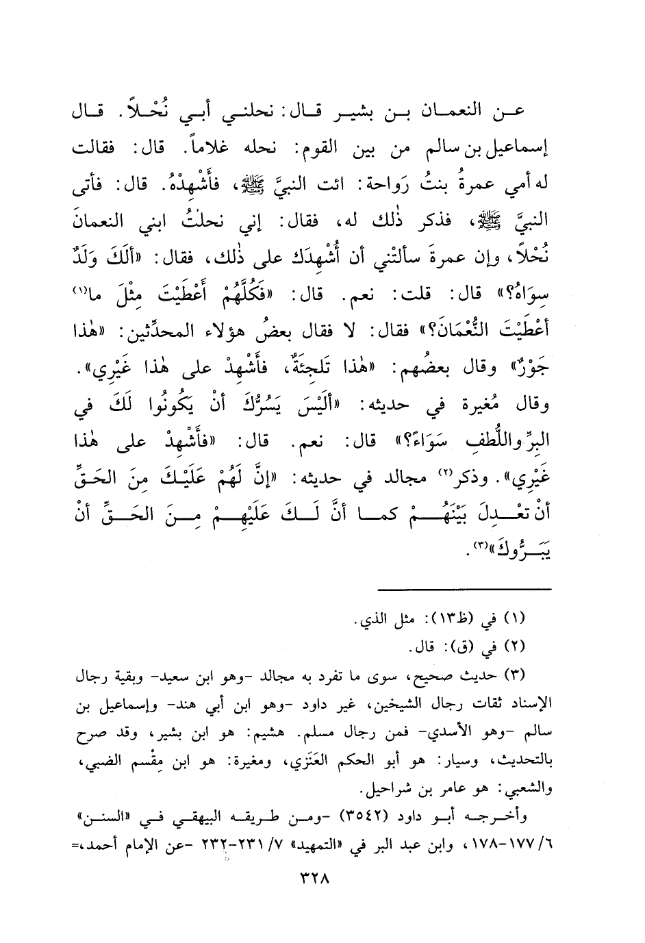 عَنِ النُّعْمَانِ بْنِ بَشِيرٍ، قَالَ: نَحَلَنِي أَبِي نُحْلًا، قَالَ إِسْمَاعِيلُ بْنُ سَالِمٍ مِنْ بَيْنِ الْقَوْمِ: نَحَلَهُ غُلَامًا، قَالَ: فَقَالَتْ لَهُ أُمِّي عَمْرَةُ بِنْتُ رَوَاحَةَ: ائْتِ النَّبِيَّ صَلَّى اللهُ عَلَيْهِ وَسَلَّمَ، فَأَشْهِدْهُ، قَالَ: فَأَتَى النَّبِيَّ صَلَّى اللهُ عَلَيْهِ وَسَلَّمَ، فَذَكَرَ ذَلِكَ لَهُ، فَقَالَ: إِنِّي نَحَلْتُ ابْنِي النُّعْمَانَ نُحْلًا، وَإِنَّ عَمْرَةَ سَأَلَتْنِي أَنْ أُشْهِدَكَ عَلَى ذَلِكَ، فَقَالَ: " أَلَكَ وَلَدٌ سِوَاهُ؟ " قَالَ: قُلْتُ: نَعَمْ، قَالَ: " فَكُلَّهُمْ أَعْطَيْتَ مِثْلَ مَا (١) أَعْطَيْتَ النُّعْمَانَ؟ " فَقَالَ: لَا، فَقَالَ بَعْضُ هَؤُلَاءِ الْمُحَدِّثِينَ: " هَذَا جَوْرٌ " وَقَالَ بَعْضُهُمْ: " هَذَا تَلْجِئَةٌ، فَأَشْهِدْ عَلَى هَذَا غَيْرِي "، وَقَالَ مُغِيرَةُ فِي حَدِيثِهِ: " أَلَيْسَ يَسُرُّكَ أَنْ يَكُونُوا لَكَ فِي الْبِرِّ وَاللُّطْفِ سَوَاءً؟ " قَالَ: نَعَمْ، قَالَ: " فَأَشْهِدْ عَلَى هَذَا غَيْرِي " وَذَكَرَ (٢) مُجَالِدٌ فِي حَدِيثِهِ: " إِنَّ لَهُمْ عَلَيْكَ مِنَ الْحَقِّ أَنْ تَعْدِلَ بَيْنَهُمْ، كَمَا أَنَّ لَكَ عَلَيْهِمْ مِنَ الْحَقِّ أَنْ يَبَرُّوكَ " (٣)