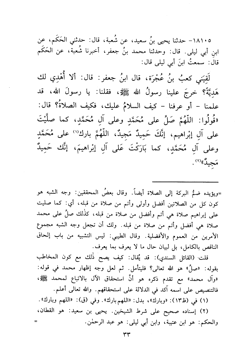 ١٨١٠٥ - حَدَّثَنَا يَحْيَى بْنُ سَعِيدٍ، عَنْ شُعْبَةَ، قَالَ: حَدَّثَنِي الْحَكَمُ، عَنِ ابْنِ أَبِي لَيْلَى، قَالَ: وحَدَّثَنَا مُحَمَّدُ بْنُ جَعْفَرٍ، أَخْبَرَنَا شُعْبَةُ، عَنِ الْحَكَمِ، قَالَ: سَمِعْتُ ابْنَ أَبِي لَيْلَى قَالَ: لَقِيَنِي كَعْبُ بْنُ عُجْرَةَ قَالَ ابْنُ جَعْفَرٍ قَالَ: أَلَا أُهْدِي لَكَ هَدِيَّةً؟ خَرَجَ عَلَيْنَا رَسُولُ اللهِ صَلَّى اللهُ عَلَيْهِ وَسَلَّمَ، فَقُلْنَا: يَا رَسُولَ اللهِ، قَدْ عَلِمْنَا، أَوْ عَرَفْنَا، كَيْفَ السَّلَامُ عَلَيْكَ، فَكَيْفَ الصَّلَاةُ؟ قَالَ: " قُولُوا اللهُمَّ صَلِّ عَلَى مُحَمَّدٍ، وَعَلَى آلِ مُحَمَّدٍ، كَمَا صَلَّيْتَ عَلَى آلِ إِبْرَاهِيمَ، إِنَّكَ حَمِيدٌ مَجِيدٌ، اللهُمَّ بَارِكْ (١) عَلَى مُحَمَّدٍ، وَعَلَى آلِ مُحَمَّدٍ، كَمَا بَارَكْتَ عَلَى آلِ إِبْرَاهِيمَ إِنَّكَ حَمِيدٌ مَجِيدٌ " (٢)