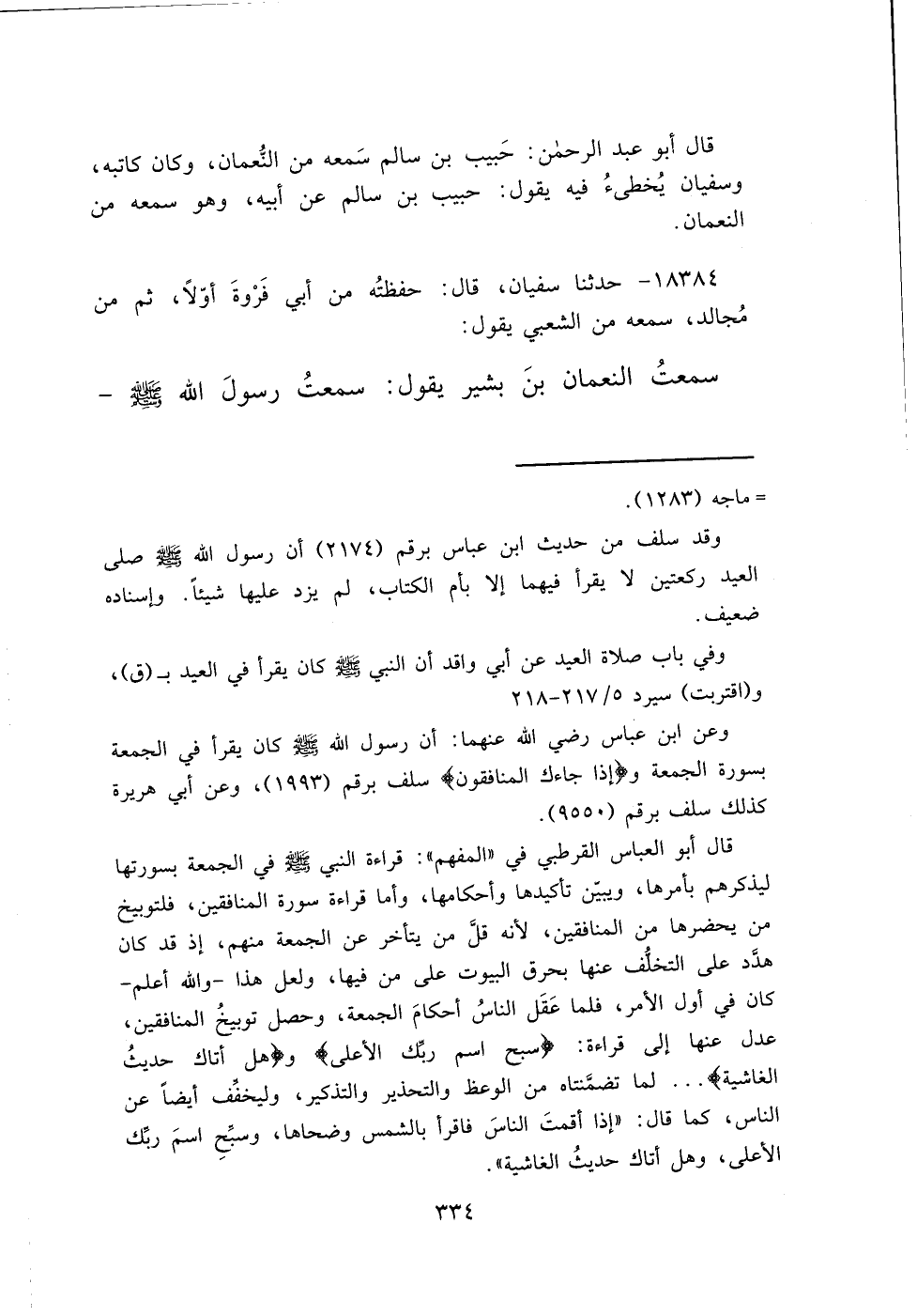 وفي باب صلاة العيد عن أبي واقد أن النبي صَلَّى اللهُ عَلَيْهِ وَسَلَّمَ كان يقرأ في العيد بـ (ق) ، و (اقتربت) سيرد ٥/٢١٧-٢١٨ وعن ابن عباس رضي الله عنهما: أن رسول الله صَلَّى اللهُ عَلَيْهِ وَسَلَّمَ كان يقرأ في الجمعة بسورة الجمعة و (إذا جاءك المنافقون) سلف برقم (١٩٩٣) ، وعن أبي هريرة كذلك سلف برقم (٩٥٥٠) .