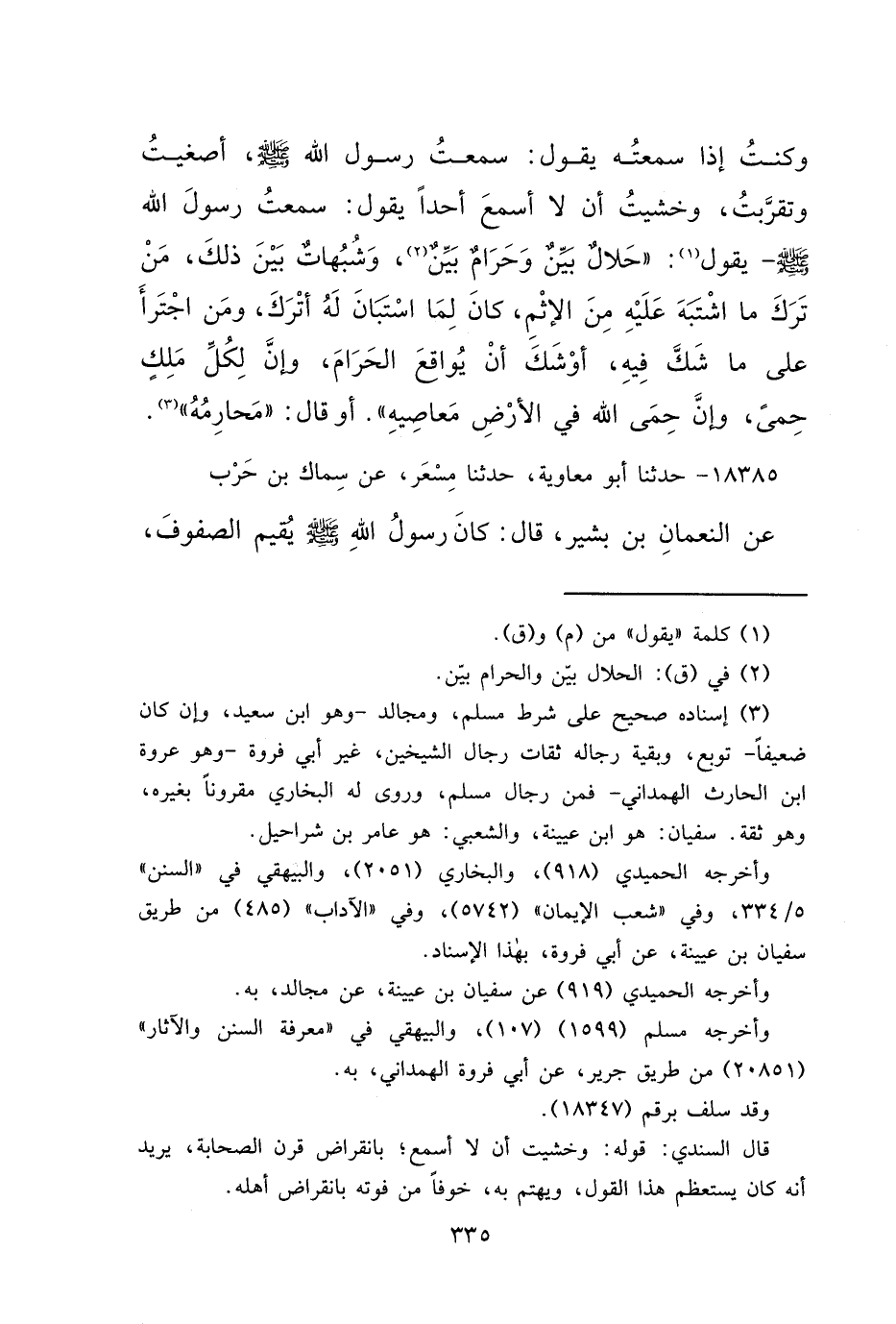 وَكُنْتُ إِذَا سَمِعْتُهُ يَقُولُ: سَمِعْتُ رَسُولَ اللهِ صَلَّى اللهُ عَلَيْهِ وَسَلَّمَ أَصْغَيْتُ، وَتَقَرَّبْتُ، وَخَشِيتُ أَنْ لَا أَسْمَعَ أَحَدًا يَقُولُ: سَمِعْتُ رَسُولَ اللهِ صَلَّى اللهُ عَلَيْهِ وَسَلَّمَ، يَقُولُ: (١) " حَلَالٌ بَيِّنٌ، وَحَرَامٌ بَيِّنٌ، (٢) وَشُبُهَاتٌ بَيْنَ ذَلِكَ، مَنْ تَرَكَ مَا اشْتَبَهَ عَلَيْهِ مِنَ الْإِثْمِ، كَانَ لِمَا اسْتَبَانَ لَهُ أَتْرَكَ، وَمَنِ اجْتَرَأَ عَلَى مَا شَكَّ فِيهِ، أَوْشَكَ أَنْ يُوَاقِعَ الْحَرَامَ، وَإِنَّ لِكُلِّ مَلِكٍ حِمًى، وَإِنَّ حِمَى اللهِ فِي الْأَرْضِ مَعَاصِيهِ " أَوْ قَالَ: " مَحَارِمُهُ " (٣)