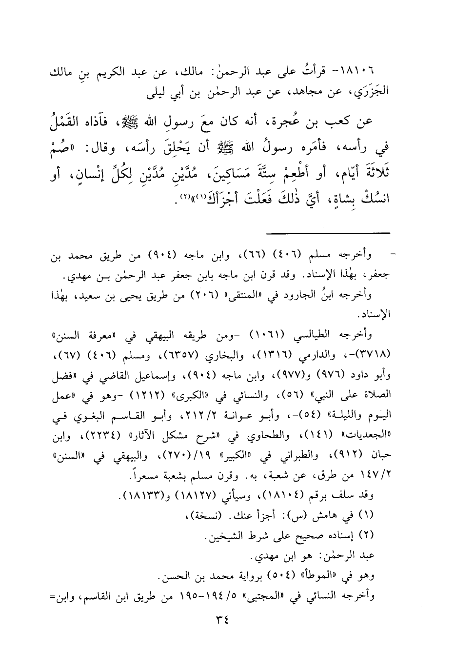 ١٨١٠٦ - قَرَأْتُ عَلَى عَبْدِ الرَّحْمَنِ: مَالِكٌ، عَنْ عَبْدِ الْكَرِيمِ بْنِ مَالِكٍ الْجَزَرِيِّ، عَنْ مُجَاهِدٍ، عَنْ عَبْدِ الرَّحْمَنِ بْنِ أَبِي لَيْلَى، عَنْ كَعْبِ بْنِ عُجْرَةَ أَنَّهُ كَانَ مَعَ رَسُولِ اللهِ صَلَّى اللهُ عَلَيْهِ وَسَلَّمَ، فَأَذَاهُ الْقَمْلُ فِي رَأْسِهِ، فَأَمَرَهُ رَسُولُ اللهِ صَلَّى اللهُ عَلَيْهِ وَسَلَّمَ أَنْ يَحْلِقَ رَأْسَهُ، وَقَالَ: " صُمْ ثَلَاثَةَ أَيَّامٍ، أَوْ أَطْعِمْ سِتَّةَ مَسَاكِينَ، مُدَّيْنِ مُدَّيْنِ لِكُلِّ إِنْسَانٍ، أَوْ انْسُكْ بِشَاةٍ، أَيَّ ذَلِكَ فَعَلْتَ أَجْزَأَكَ (١) " (٢)