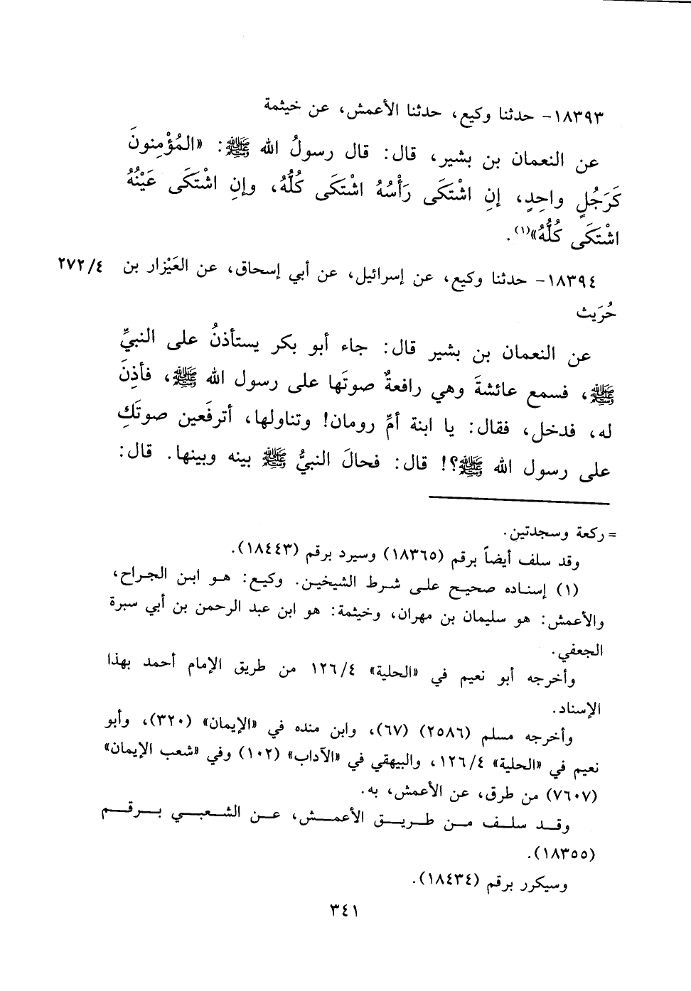 ١٨٣٩٣ - حَدَّثَنَا وَكِيعٌ، حَدَّثَنَا الْأَعْمَشُ، عَنْ خَيْثَمَةَ، عَنِ النُّعْمَانِ بْنِ بَشِيرٍ، قَالَ: قَالَ رَسُولُ اللهِ صَلَّى اللهُ عَلَيْهِ وَسَلَّمَ: " الْمُؤْمِنُونَ كَرَجُلٍ وَاحِدٍ، إِنْ اشْتَكَى رَأْسُهُ اشْتَكَى كُلُّهُ، وَإِنْ اشْتَكَى عَيْنُهُ اشْتَكَى كُلُّهُ " (١)