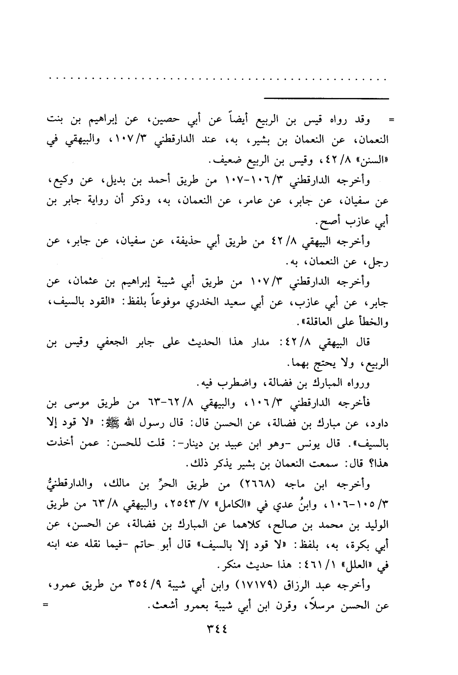 فأخرجه الدارقطني ٣/١٠٦، والبيهقي ٨/٦٢-٦٣ من طريق موسى بن داود، عن مبارك بن فضالة، عن الحسن قال: قال رسول الله صَلَّى اللهُ عَلَيْهِ وَسَلَّمَ: "لا قود إلا بالسيف". قال يونس- وهو ابن عبيد بن دينار-: قلت للحسن: عمن أخذت هذا؟ قال: سمعت النعمان بن بشير يذكر ذلك.