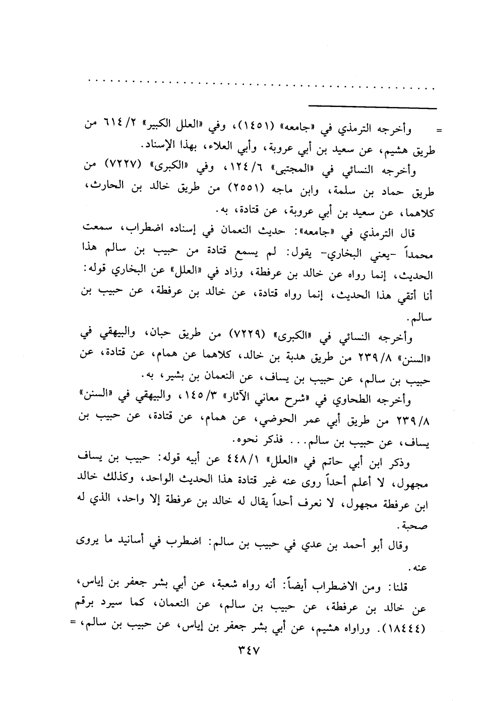 قال الترمذي في "جامعه": حديث النعمان في إسناده اضطراب، سمعت محمداً- يعني البخاري- يقول: لم يسمع قتادة من حبيب بن سالم هذا الحديث، إنما رواه عن خالد بن عرفطة، وزاد في "العلل" عن البخاري قوله: أنا أتقي هذا الحديث، إنما رواه قتادة، عن خالد بن عرفطة، عن حبيب بن سالم.