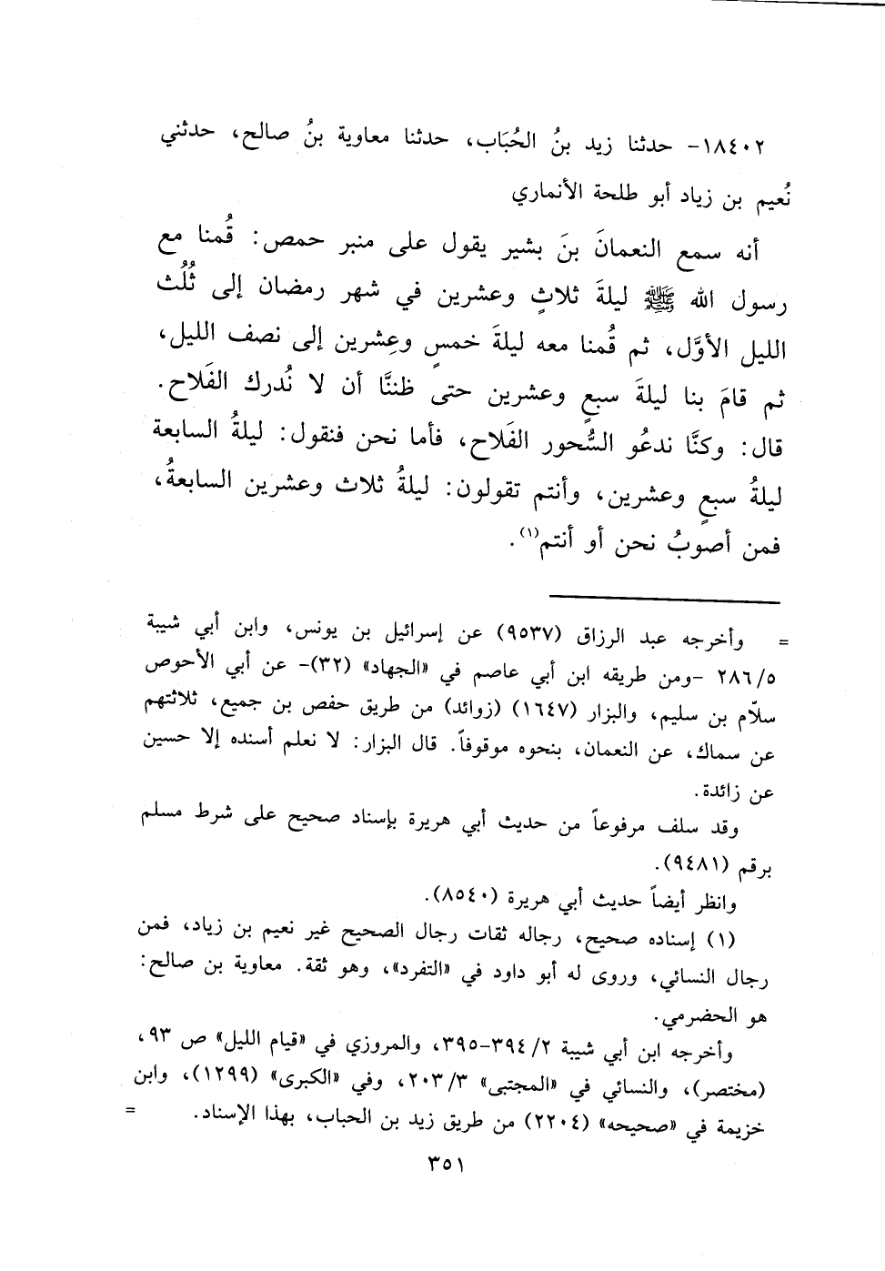 ١٨٤٠٢ - حَدَّثَنَا زَيْدُ بْنُ الْحُبَابِ، حَدَّثَنَا مُعَاوِيَةُ بْنُ صَالِحٍ، حَدَّثَنِي نُعَيْمُ بْنُ زِيَادٍ أَبُو طَلْحَةَ الْأَنْمَارِيُّ، أَنَّهُ سَمِعَ النُّعْمَانَ بْنَ بَشِيرٍ، يَقُولُ عَلَى مِنْبَرِ حِمْصَ: " قُمْنَا مَعَ رَسُولِ اللهِ صَلَّى اللهُ عَلَيْهِ وَسَلَّمَ، لَيْلَةَ ثَلَاثٍ وَعِشْرِينَ فِي شَهْرِ رَمَضَانَ إِلَى ثُلُثِ اللَّيْلِ الْأَوَّلِ، ثُمَّ قُمْنَا مَعَهُ لَيْلَةَ خَمْسٍ وَعِشْرِينَ إِلَى نِصْفِ اللَّيْلِ، ثُمَّ قَامَ بِنَا لَيْلَةَ سَبْعٍ وَعِشْرِينَ حَتَّى ظَنَنَّا أَنْ لَا نُدْرِكَ الْفَلَاحَ، قَالَ: وَكُنَّا نَدْعُو السُّحُورَ الْفَلَاحَ " " فَأَمَّا نَحْنُ فَنَقُولُ: لَيْلَةُ السَّابِعَةِ لَيْلَةُ سَبْعٍ وَعِشْرِينَ، وَأَنْتُمْ تَقُولُونَ: لَيْلَةُ ثَلَاثٍ وَعِشْرِينَ السَّابِعَةُ، فَمَنْ أَصَوْبُ نَحْنُ، أَوْ أَنْتُمْ " (١)