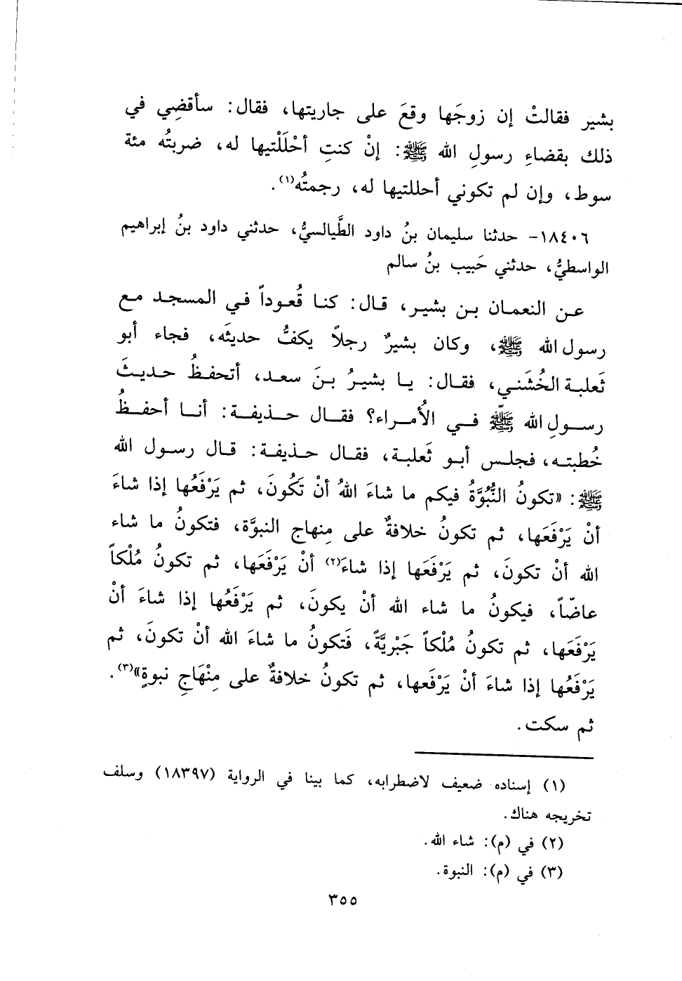 ١٨٤٠٦ - حَدَّثَنَا سُلَيْمَانُ بْنُ دَاوُدَ الطَّيَالِسِيُّ، حَدَّثَنِي دَاوُدُ بْنُ إِبْرَاهِيمَ الْوَاسِطِيُّ، حَدَّثَنِي حَبِيبُ بْنُ سَالِمٍ، عَنِ النُّعْمَانِ بْنِ بَشِيرٍ، قَالَ: كُنَّا قُعُودًا فِي الْمَسْجِدِ مَعَ رَسُولِ اللهِ صَلَّى اللهُ عَلَيْهِ وَسَلَّمَ، وَكَانَ بَشِيرٌ رَجُلًا يَكُفُّ حَدِيثَهُ، فَجَاءَ أَبُو ثَعْلَبَةَ الْخُشَنِيُّ، فَقَالَ: يَا بَشِيرُ بْنَ سَعْدٍ أَتَحْفَظُ حَدِيثَ رَسُولِ اللهِ صَلَّى اللهُ عَلَيْهِ وَسَلَّمَ، فِي الْأُمَرَاءِ؟ فَقَالَ حُذَيْفَةُ: أَنَا أَحْفَظُ خُطْبَتَهُ، فَجَلَسَ أَبُو ثَعْلَبَةَ، فَقَالَ حُذَيْفَةُ: قَالَ رَسُولُ اللهِ صَلَّى اللهُ عَلَيْهِ وَسَلَّمَ: " تَكُونُ النُّبُوَّةُ فِيكُمْ مَا شَاءَ اللهُ أَنْ تَكُونَ، ثُمَّ يَرْفَعُهَا إِذَا شَاءَ (٢) أَنْ يَرْفَعَهَا، ثُمَّ تَكُونُ خِلَافَةٌ عَلَى مِنْهَاجِ النُّبُوَّةِ، فَتَكُونُ مَا شَاءَ اللهُ أَنْ تَكُونَ، ثُمَّ يَرْفَعُهَا إِذَا شَاءَ اللهُ أَنْ يَرْفَعَهَا، ثُمَّ تَكُونُ مُلْكًا عَاضًّا، فَيَكُونُ مَا شَاءَ اللهُ أَنْ يَكُونَ، ثُمَّ يَرْفَعُهَا إِذَا شَاءَ أَنْ يَرْفَعَهَا، ثُمَّ تَكُونُ مُلْكًا جَبْرِيَّةً، فَتَكُونُ مَا شَاءَ اللهُ أَنْ تَكُونَ، ثُمَّ يَرْفَعُهَا إِذَا شَاءَ أَنْ يَرْفَعَهَا، ثُمَّ تَكُونُ خِلَافَةً عَلَى مِنْهَاجِ نُبُوَّةٍ " (٣) ثُمَّ سَكَتَ،