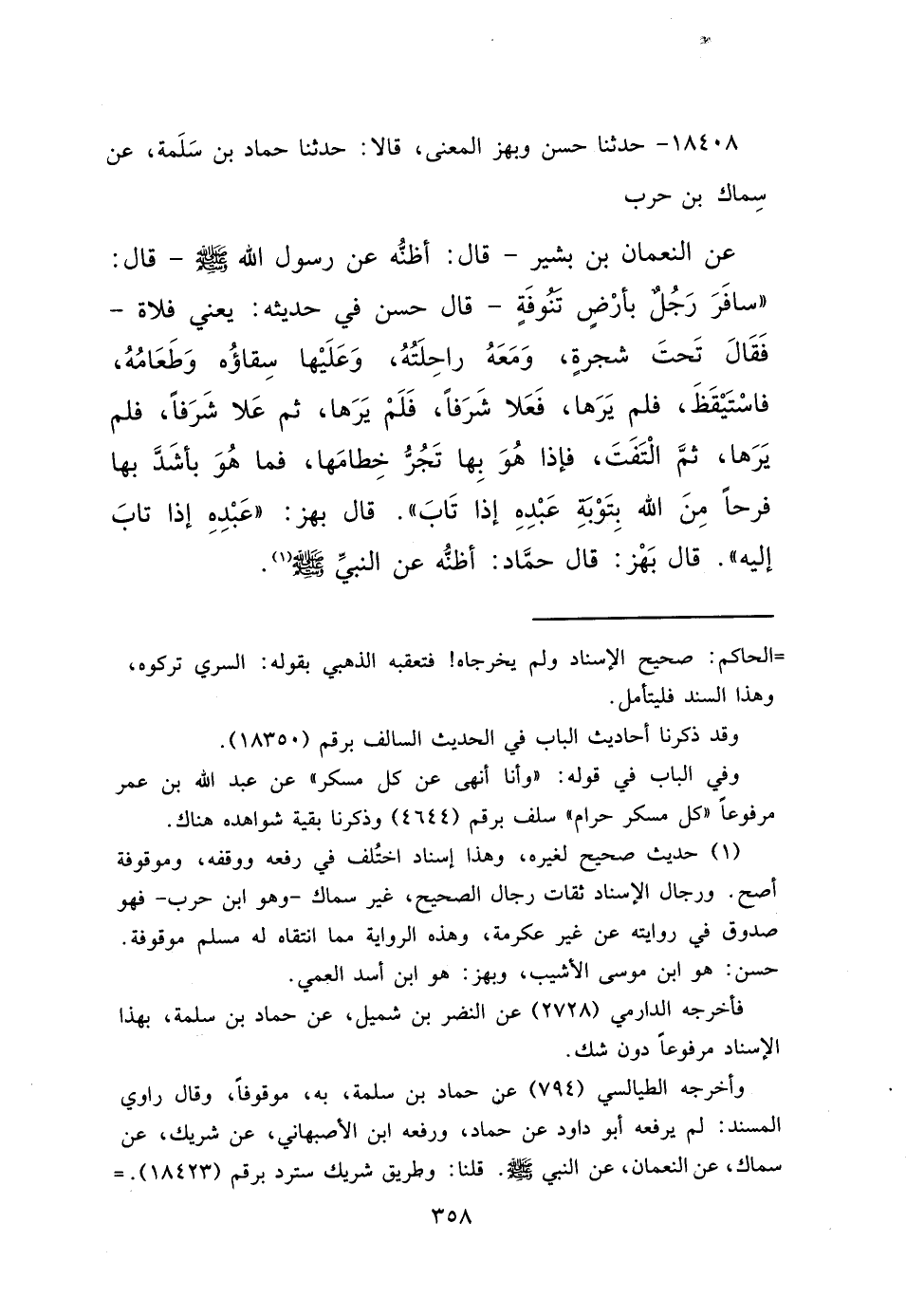 ١٨٤٠٨ - حَدَّثَنَا حَسَنٌ، وَبَهْزٌ الْمَعْنَى، قَالَا: حَدَّثَنَا حَمَّادُ بْنُ سَلَمَةَ، عَنْ سِمَاكِ بْنِ حَرْبٍ، عَنِ النُّعْمَانِ بْنِ بَشِيرٍ، قَالَ: أَظُنُّهُ عَنْ رَسُولِ اللهِ صَلَّى اللهُ عَلَيْهِ وَسَلَّمَ، قَالَ: " سَافَرَ رَجُلٌ بِأَرْضٍ تَنُوفَةٍ، قَالَ حَسَنٌ فِي حَدِيثِهِ: يَعْنِي فَلَاةً، فَقَالَ: تَحْتَ شَجَرَةٍ، وَمَعَهُ رَاحِلَتُهُ، وَعَلَيْهَا سِقَاؤُهُ، وَطَعَامُهُ، فَاسْتَيْقَظَ فَلَمْ يَرَهَا، فَعَلَا شَرَفًا، فَلَمْ يَرَهَا، ثُمَّ عَلَا شَرَفًا، فَلَمْ يَرَهَا، ثُمَّ الْتَفَتَ، فَإِذَا هُوَ بِهَا تَجُرُّ خِطَامَهَا، فَمَا هُوَ بِأَشَدَّ بِهَا فَرَحًا مِنَ اللهِ بِتَوْبَةِ عَبْدِهِ إِذَا تَابَ " قَالَ بَهْزٌ: " عَبْدِهِ إِذَا تَابَ إِلَيْهِ "، قَالَ بَهْزٌ: قَالَ حَمَّادٌ: أَظُنُّهُ عَنِ النَّبِيِّ صَلَّى اللهُ عَلَيْهِ وَسَلَّمَ (١)