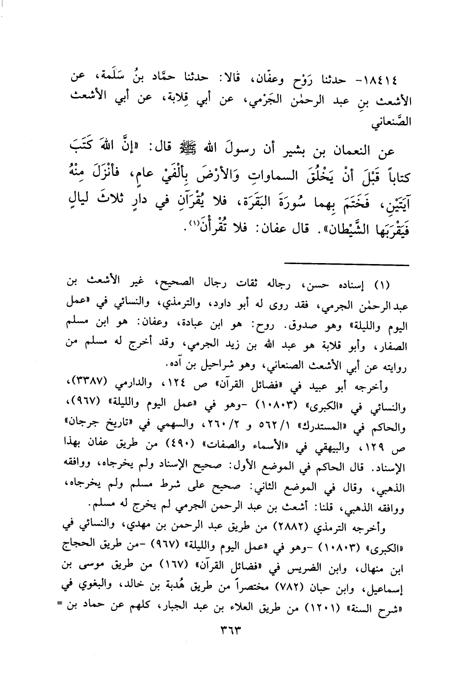 ١٨٤١٤ - حَدَّثَنَا رَوْحٌ، وَعَفَّانُ، قَالَا: حَدَّثَنَا حَمَّادُ بْنُ سَلَمَةَ، عَنِ الْأَشْعَثِ بْنِ عَبْدِ الرَّحْمَنِ الْجَرْمِيِّ، عَنْ أَبِي قِلَابَةَ، عَنْ أَبِي الْأَشْعَثِ الصَّنْعَانِيِّ، عَنِ النُّعْمَانِ بْنِ بَشِيرٍ، أَنَّ رَسُولَ اللهِ صَلَّى اللهُ عَلَيْهِ وَسَلَّمَ، قَالَ: " إِنَّ اللهَ كَتَبَ كِتَابًا قَبْلَ أَنْ يَخْلُقَ السَّمَوَاتِ وَالْأَرْضَ بِأَلْفَيْ عَامٍ، فَأَنْزَلَ مِنْهُ آيَتَيْنِ، فَخَتَمَ بِهِمَا سُورَةَ الْبَقَرَةِ، وَلَا يُقْرَآنِ فِي دَارٍ ثَلَاثَ لَيَالٍ فَيَقْرَبَهَا الشَّيْطَانُ " قَالَ عَفَّانُ: " فَلَا تُقْرَأنَّ " (١)
