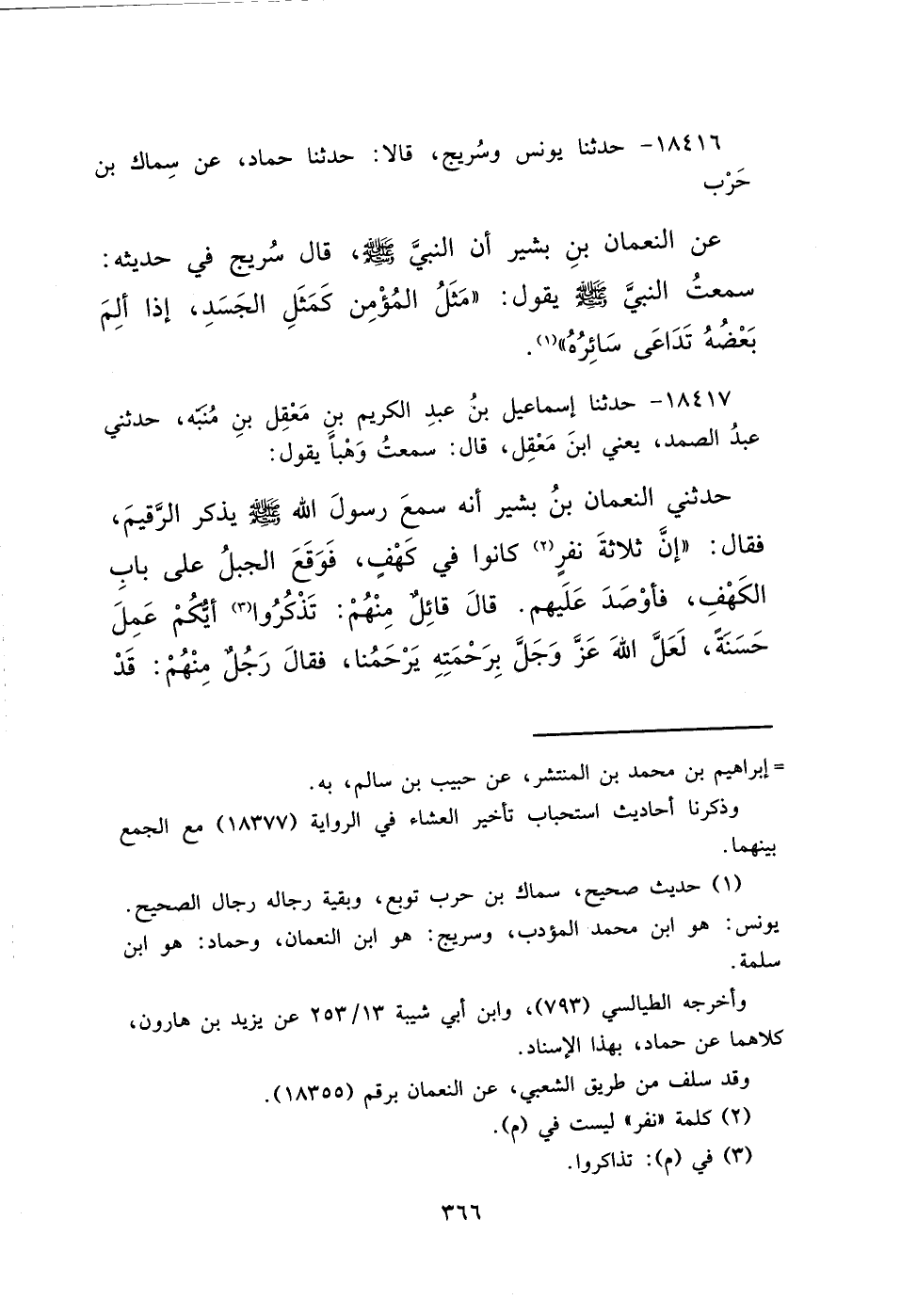 ١٨٤١٦ - حَدَّثَنَا يُونُسُ، وَسُرَيْجٌ، قَالَا: حَدَّثَنَا حَمَّادٌ، عَنْ سِمَاكِ بْنِ حَرْبٍ، عَنِ النُّعْمَانِ بْنِ بَشِيرٍ، أَنَّ النَّبِيَّ صَلَّى اللهُ عَلَيْهِ وَسَلَّمَ، وَقَالَ سُرَيْجٌ فِي حَدِيثِهِ: سَمِعْتُ النَّبِيَّ صَلَّى اللهُ عَلَيْهِ وَسَلَّمَ، يَقُولُ: " مَثَلُ الْمُؤْمِنِ كَمَثَلِ الْجَسَدِ، إِذَا أَلِمَ بَعْضُهُ تَدَاعَى سَائِرُهُ " (١)