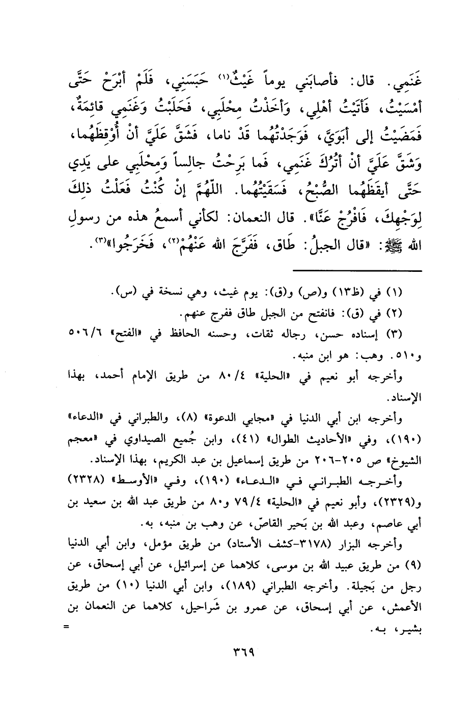 غَنَمِي، قَالَ: فَأَصَابَنِي يَوْمًا غَيْثٌ (١) حَبَسَنِي، فَلَمْ أَبْرَحْ حَتَّى أَمْسَيْتُ، فَأَتَيْتُ أَهْلِي وَأَخَذْتُ مِحْلَبِي، فَحَلَبْتُ وَغَنَمِي قَائِمَةٌ، فَمَضَيْتُ إِلَى أَبَوَيَّ، فَوَجَدْتُهُمَا قَدْ نَامَا، فَشَقَّ عَلَيَّ أَنْ أُوقِظَهُمَا وَشَقَّ عَلَيَّ أَنْ أَتْرُكَ غَنَمِي، فَمَا بَرِحْتُ جَالِسًا، وَمِحْلَبِي عَلَى يَدِي حَتَّى أَيْقَظَهُمَا الصُّبْحُ، فَسَقَيْتُهُمَا. اللهُمَّ إِنْ كُنْتُ فَعَلْتُ ذَلِكَ لِوَجْهِكَ، فَافْرُجْ عَنَّا " قَالَ النُّعْمَانُ: لَكَأَنِّي أَسْمَعُ هَذِهِ مِنْ رَسُولِ اللهِ صَلَّى اللهُ عَلَيْهِ وَسَلَّمَ، " قَالَ الْجَبَلُ: طَاقْ، فَفَرَّجَ اللهُ عَنْهُمْ (٢) ، فَخَرَجُوا " (٣)