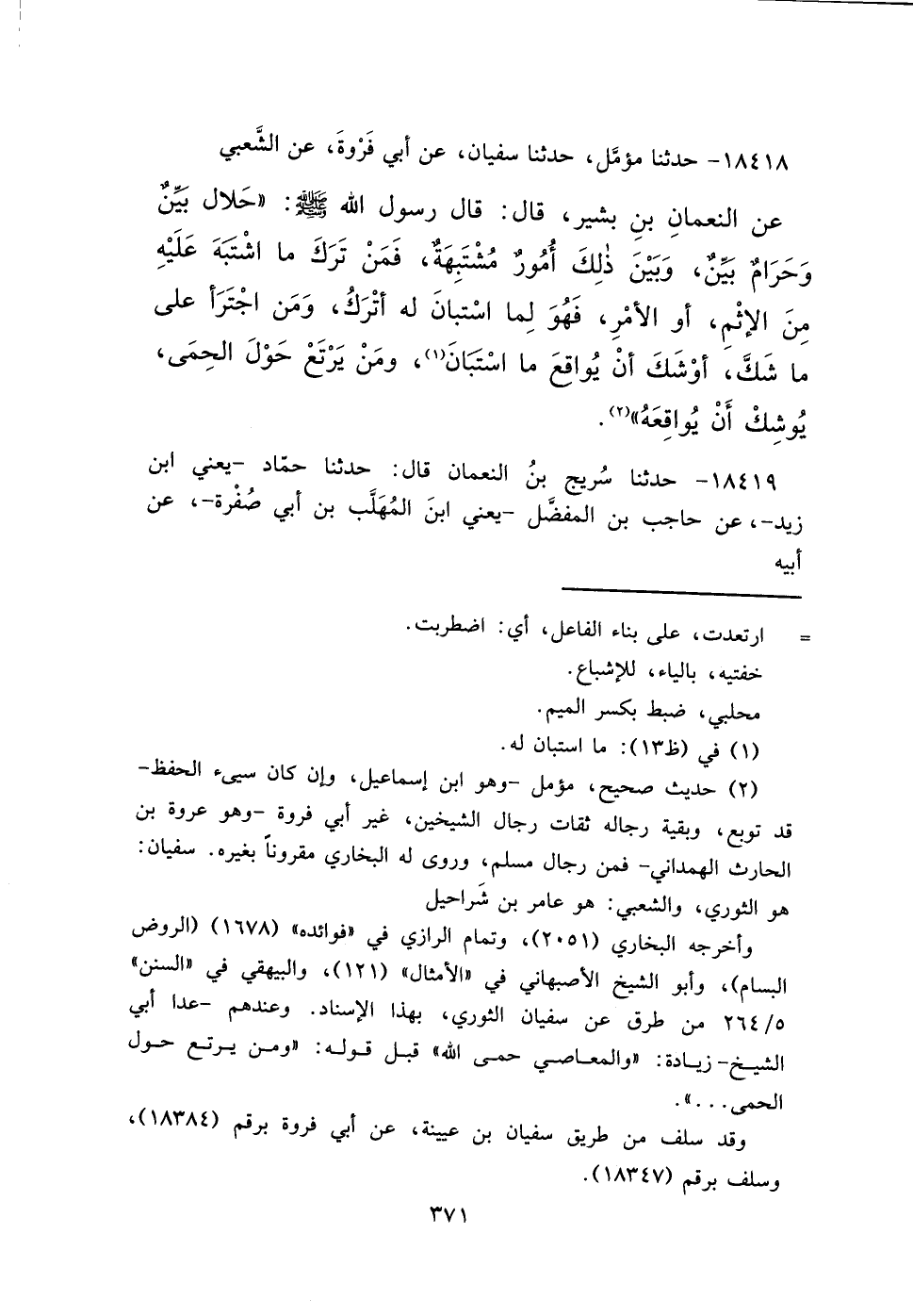 ١٨٤١٨ - حَدَّثَنَا مُؤَمَّلٌ، حَدَّثَنَا سُفْيَانُ، عَنْ أَبِي فَرْوَةَ، عَنِ الشَّعْبِيِّ، عَنْ النُّعْمَانِ بْنِ بَشِيرٍ، قَالَ: قَالَ رَسُولُ اللهِ صَلَّى اللهُ عَلَيْهِ وَسَلَّمَ: " حَلَالٌ بَيِّنٌ، وَحَرَامٌ بَيِّنٌ، وَبَيْنَ ذَلِكَ أُمُورٌ مُشْتَبِهَةٌ، فَمَنْ تَرَكَ مَا اشْتَبَهَ عَلَيْهِ مِنَ الْإِثْمِ، أَوِ الْأَمْرِ، فَهُوَ لِمَا اسْتَبَانَ لَهُ أَتْرَكُ، وَمَنِ اجْتَرَأَ عَلَى مَا شَكَّ، أَوْشَكَ أَنْ يُوَاقِعَ مَا اسْتَبَانَ (١) ، وَمَنْ يَرْتَعْ حَوْلَ الْحِمَى، يُوشِكْ أَنْ يُوَاقِعَهُ " (٢)