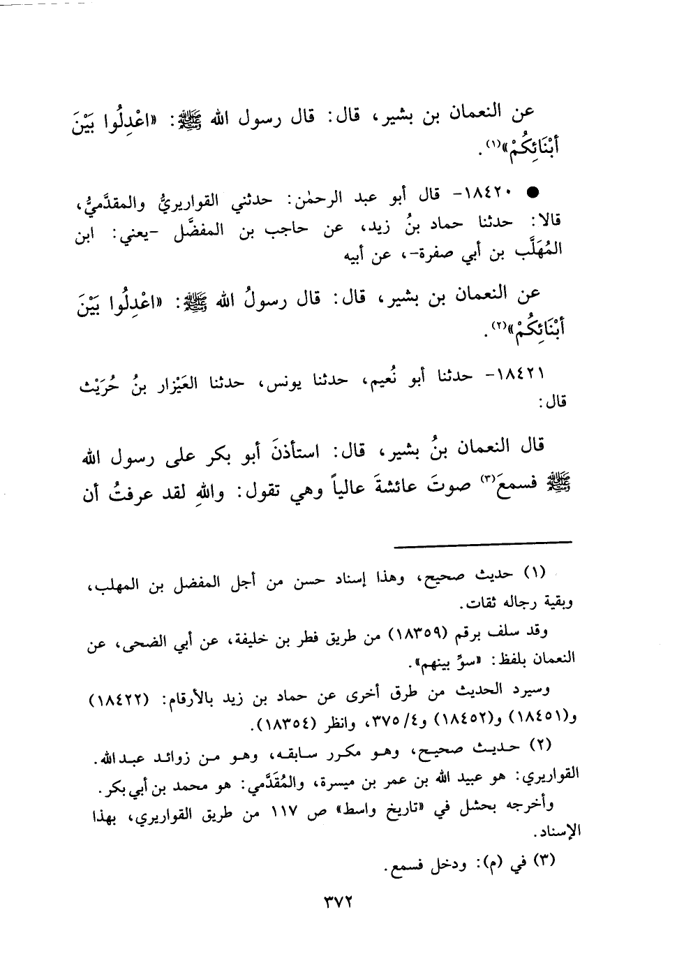 عَنِ النُّعْمَانِ بْنِ بَشِيرٍ، قَالَ: قَالَ رَسُولُ اللهِ صَلَّى اللهُ عَلَيْهِ وَسَلَّمَ: " اعْدِلُوا بَيْنَ أَبْنَائِكُمْ " (١)