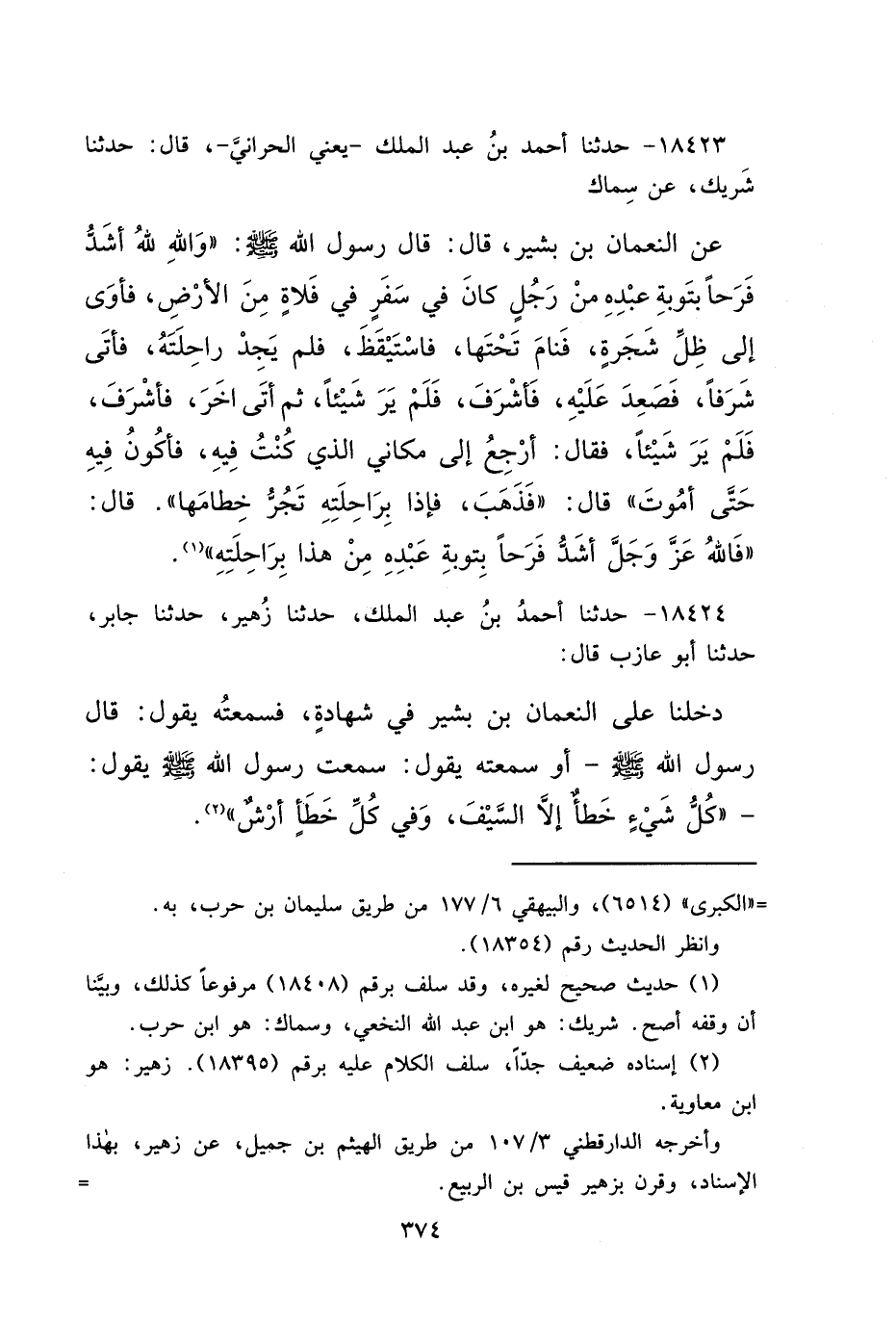 ١٨٤٢٣ - حَدَّثَنَا أَحْمَدُ بْنُ عَبْدِ الْمَلِكِ يَعْنِي الْحَرَّانِيَّ، قَالَ: حَدَّثَنَا شَرِيكٌ، عَنْ سِمَاكٍ، عَنِ النُّعْمَانِ بْنِ بَشِيرٍ، قَالَ: قَالَ رَسُولُ اللهِ صَلَّى اللهُ عَلَيْهِ وَسَلَّمَ: " وَاللهِ لَلَّهُ أَشَدُّ فَرَحًا بِتَوْبَةِ عَبْدِهِ مِنْ رَجُلٍ كَانَ فِي سَفَرٍ فِي فَلَاةٍ مِنَ الْأَرْضِ، فَآوَى إِلَى ظِلِّ شَجَرَةٍ، فَنَامَ تَحْتَهَا، فَاسْتَيْقَظَ، فَلَمْ يَجِدْ رَاحِلَتَهُ، فَأَتَى شَرَفًا، فَصَعِدَ عَلَيْهِ، فَأَشْرَفَ، فَلَمْ يَرَ شَيْئًا، ثُمَّ أَتَى آخَرَ، فَأَشْرَفَ، فَلَمْ يَرَ شَيْئًا، فَقَالَ: أَرْجِعُ إِلَى مَكَانِي الَّذِي كُنْتُ فِيهِ، فَأَكُونُ فِيهِ حَتَّى أَمُوتَ "، قَالَ: " فَذَهَبَ، فَإِذَا بِرَاحِلَتِهِ تَجُرُّ خِطَامَهَا ". قَالَ: " فَاللهُ عَزَّ وَجَلَّ أَشَدُّ فَرَحًا بِتَوْبَةِ عَبْدِهِ مِنْ هَذَا بِرَاحِلَتِهِ " (١)