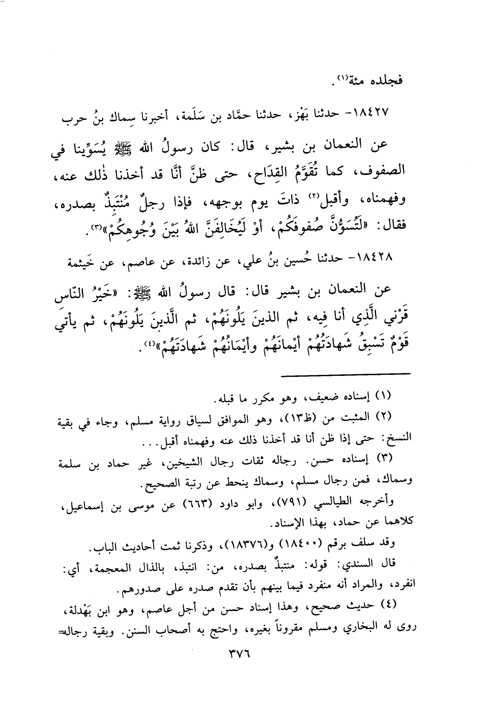 ١٨٤٢٧ - حَدَّثَنَا بَهْزٌ، حَدَّثَنَا حَمَّادُ بْنُ سَلَمَةَ، أَخْبَرَنَا سِمَاكُ بْنُ حَرْبٍ، عَنِ النُّعْمَانِ بْنِ بَشِيرٍ، قَالَ: كَانَ رَسُولُ اللهِ صَلَّى اللهُ عَلَيْهِ وَسَلَّمَ، يُسَوِّينَا فِي الصُّفُوفِ، كَمَا تُقَوَّمُ الْقِدَاحُ، حَتَّى ظَنَّ أَنَّا قَدْ أَخَذْنَا ذَلِكَ عَنْهُ، وَفَهِمْنَاهُ، وَأَقْبَلَ (٢) ذَاتَ يَوْمٍ بِوَجْهِهِ، فَإِذَا رَجُلٌ مُنْتَبِذٌ بِصَدْرِهِ، فَقَالَ: " لَتُسَوُّنَّ صُفُوفَكُمْ، أَوْ لَيُخَالِفَنَّ اللهُ بَيْنَ وُجُوهِكُمْ " (٣)