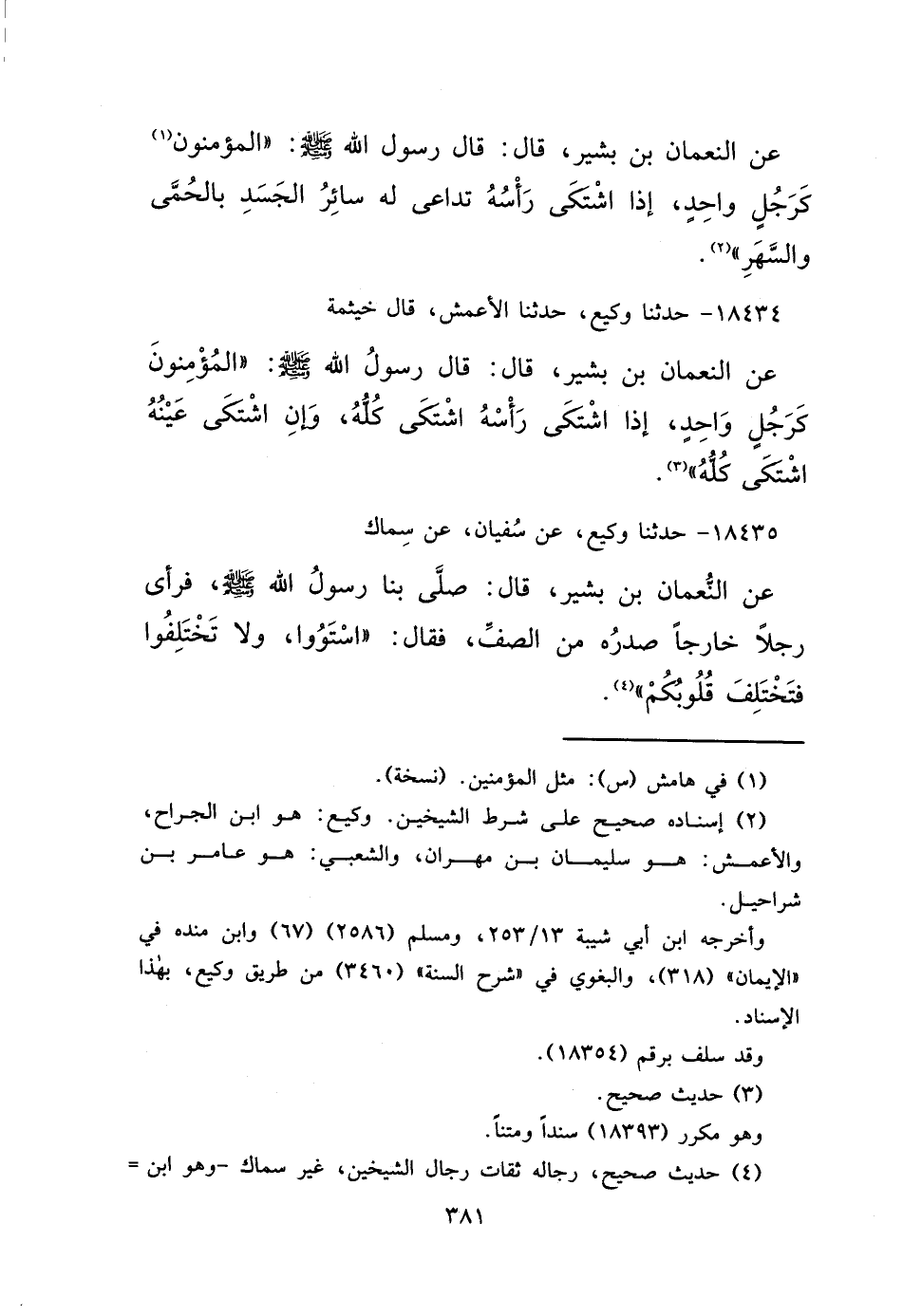 ١٨٤٣٤ - حَدَّثَنَا وَكِيعٌ، حَدَّثَنَا الْأَعْمَشُ، قَالَ خَيْثَمَةُ: عَنِ النُّعْمَانِ بْنِ بَشِيرٍ، قَالَ: قَالَ رَسُولُ اللهِ صَلَّى اللهُ عَلَيْهِ وَسَلَّمَ: " الْمُؤْمِنُونَ كَرَجُلٍ وَاحِدٍ، إِذَا اشْتَكَى رَأْسُهُ اشْتَكَى كُلُّهُ، وَإِنْ اشْتَكَى عَيْنُهُ اشْتَكَى كُلُّهُ " (٣)