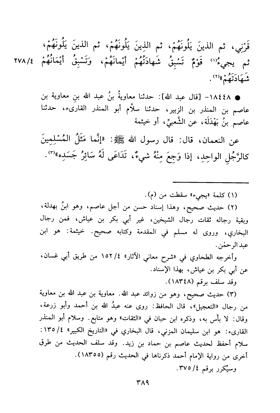 • ١٨٤٤٨ - قَالَ عَبْدُ اللهِ حَدَّثَنَا مُعَاوِيَةُ بْنُ عَبْدِ اللهِ بْنِ مُعَاوِيَةَ بْنِ عَاصِمِ بْنِ الْمُنْذِرِ بْنِ الزُّبَيْرِ، حَدَّثَنَا سَلَّامٌ أَبُو الْمُنْذِرِ الْقَارِئُ، حَدَّثَنَا عَاصِمُ بْنُ بَهْدَلَةَ، عَنِ الشَّعْبِيِّ، أَوْ خَيْثَمَةَ، عَنِ النُّعْمَانِ، قَالَ: قَالَ رَسُولُ اللهِ صَلَّى اللهُ عَلَيْهِ وَسَلَّمَ: " إِنَّمَا مَثَلُ الْمُسْلِمِينَ كَالرَّجُلِ الْوَاحِدِ، إِذَا وَجِعَ مِنْهُ شَيْءٌ تَدَاعَى لَهُ سَائِرُ جَسَدِهِ " (٣)