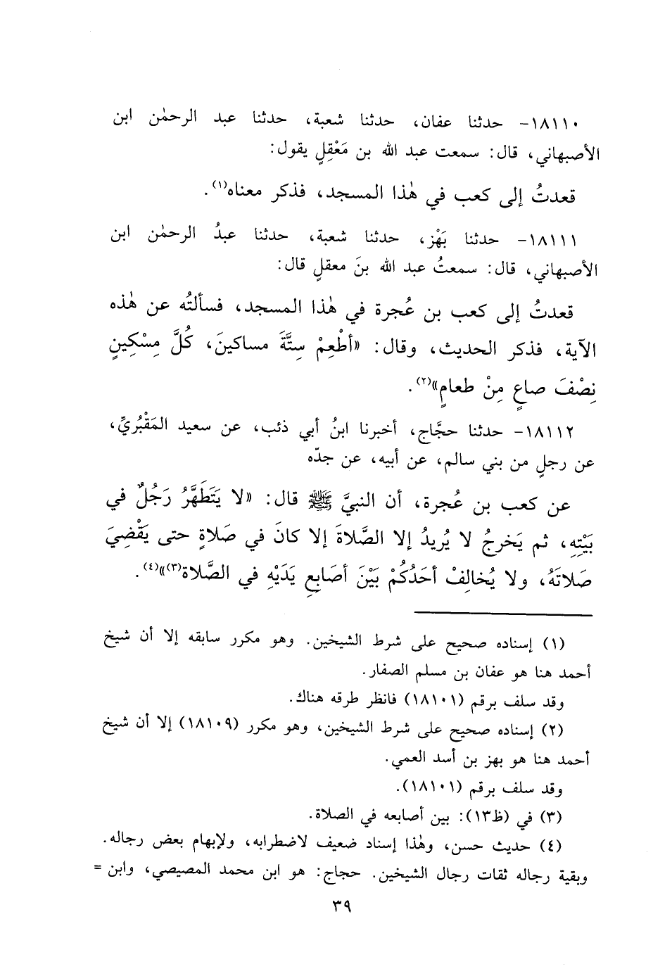 ١٨١١٢ - حَدَّثَنَا حَجَّاجٌ، أَخْبَرَنَا ابْنُ أَبِي ذِئْبٍ، عَنْ سَعِيدٍ الْمَقْبُرِيِّ، عَنْ رَجُلٍ مِنْ بَنِي سَالِمٍ، عَنْ أَبِيهِ، عَنْ جَدِّهِ، عَنْ كَعْبِ بْنِ عُجْرَةَ، أَنَّ النَّبِيَّ صَلَّى اللهُ عَلَيْهِ وَسَلَّمَ قَالَ: " لَا يَتَطَهَّرُ رَجُلٌ فِي بَيْتِهِ، ثُمَّ يَخْرُجُ لَا يُرِيدُ إِلَّا الصَّلَاةَ، إِلَّا كَانَ فِي صَلَاةٍ، حَتَّى يَقْضِيَ صَلَاتَهُ، وَلَا يُخَالِفْ أَحَدُكُمْ بَيْنَ أَصَابِعِ يَدَيْهِ فِي الصَّلَاةِ (٣) " (٤)
