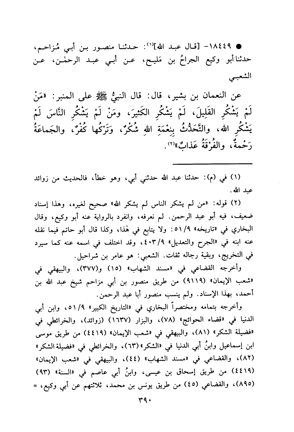 • ١٨٤٤٩ - قَالَ عَبْدُ اللهِ، (١) حَدَّثَنَا مَنْصُورُ بْنُ أَبِي مُزَاحِمٍ، حَدَّثَنَا أَبُو وَكِيعٍ الْجَرَّاحُ بْنُ مَلِيحٍ، عَنْ أَبِي عَبْدِ الرَّحْمَنِ، عَنِ الشَّعْبِيِّ، عَنِ النُّعْمَانِ بْنِ بَشِيرٍ، قَالَ: قَالَ النَّبِيُّ صَلَّى اللهُ عَلَيْهِ وَسَلَّمَ عَلَى الْمِنْبَرِ: " مَنْ لَمْ يَشْكُرِ الْقَلِيلَ، لَمْ يَشْكُرِ الْكَثِيرَ، وَمَنْ لَمْ يَشْكُرِ النَّاسَ، لَمْ يَشْكُرِ اللهَ. التَّحَدُّثُ بِنِعْمَةِ اللهِ شُكْرٌ، وَتَرْكُهَا كُفْرٌ، وَالْجَمَاعَةُ رَحْمَةٌ، وَالْفُرْقَةُ عَذَابٌ " (٢)