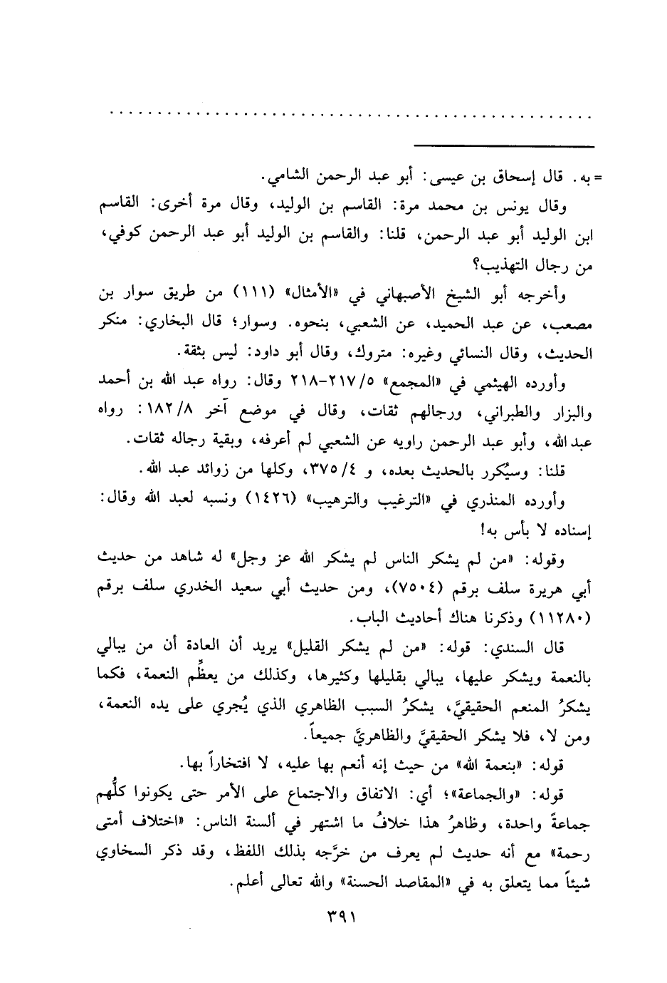 وقال يونس بن محمد مرة: القاسم بن الوليد، وقال مرة أخرى: القاسم ابن الوليد أبو عبد الرحمن، قلنا: والقاسم بن الوليد أبو عبد الرحمن كوفي، من رجال التهذيب؟