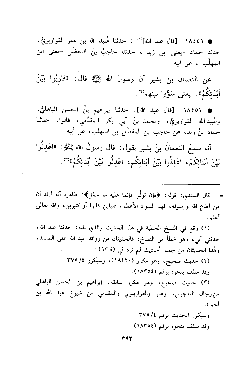 • ١٨٤٥٢ - قَالَ عَبْدُ اللهِ، حَدَّثَنَا إِبْرَاهِيمُ بْنُ الْحَسَنِ الْبَاهِلِيُّ، وَعُبَيْدُ اللهِ الْقَوَارِيرِيُّ، وَمُحَمَّدُ بْنُ أَبِي بَكْرٍ الْمُقَدَّمِيُّ، قَالُوا: حَدَّثَنَا حَمَّادُ بْنُ زَيْدٍ، عَنْ حَاجِبِ بْنِ الْمُفَضَّلِ بْنِ الْمُهَلَّبِ، عَنْ أَبِيهِ، أَنَّهُ سَمِعَ النُّعْمَانَ بْنَ بَشِيرٍ، يَقُولُ: قَالَ رَسُولُ اللهِ صَلَّى اللهُ عَلَيْهِ وَسَلَّمَ: " اعْدِلُوا بَيْنَ أَبْنَائِكُمْ، اعْدِلُوا بَيْنَ أَبْنَائِكُمْ، اعْدِلُوا بَيْنَ أَبْنَائِكُمْ " (٣)