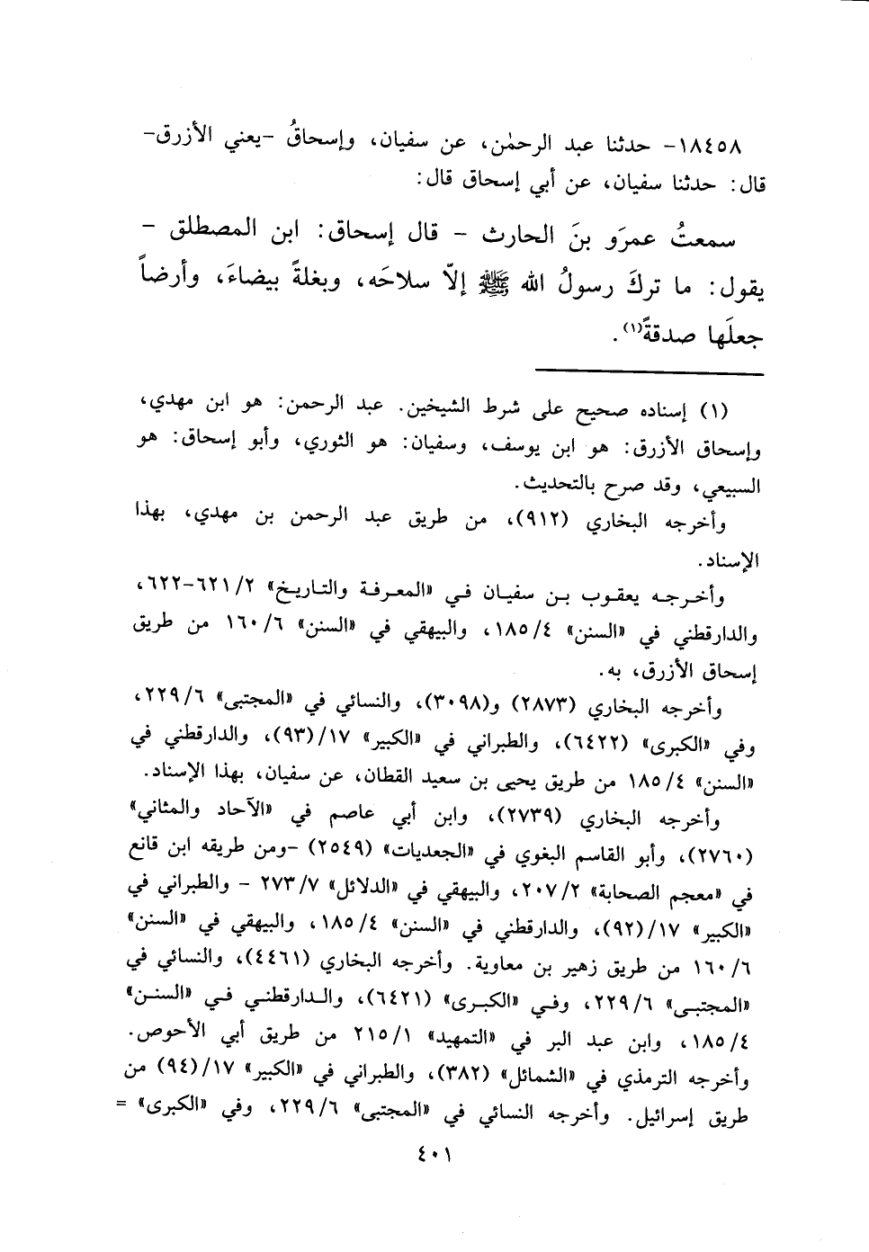 ١٨٤٥٨ - حَدَّثَنَا عَبْدُ الرَّحْمَنِ، عَنْ سُفْيَانَ، وَإِسْحَاقَ يَعْنِي الْأَزْرَقَ، قَالَ: حَدَّثَنَا سُفْيَانُ، عَنْ أَبِي إِسْحَاقَ، قَالَ: سَمِعْتُ عَمْرَو بْنَ الْحَارِثِ، قَالَ إِسْحَاقُ بْنُ الْمُصْطَلِقِ، يَقُولُ: " مَا تَرَكَ رَسُولُ اللهِ صَلَّى اللهُ عَلَيْهِ وَسَلَّمَ، إِلَّا سِلَاحَهُ، وَبَغْلَةً بَيْضَاءَ، وَأَرْضًا جَعَلَهَا صَدَقَةً " (١)